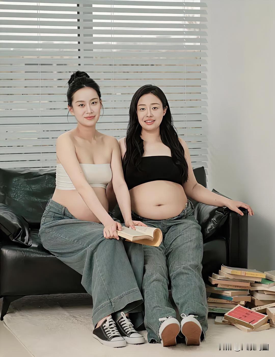 两个年轻女生孕妇摆拍,肚子贴满爱心贴纸。少女风孕照 露肚孕照 孕妈妈自拍 鲜花孕照 孕妈大肚贴
