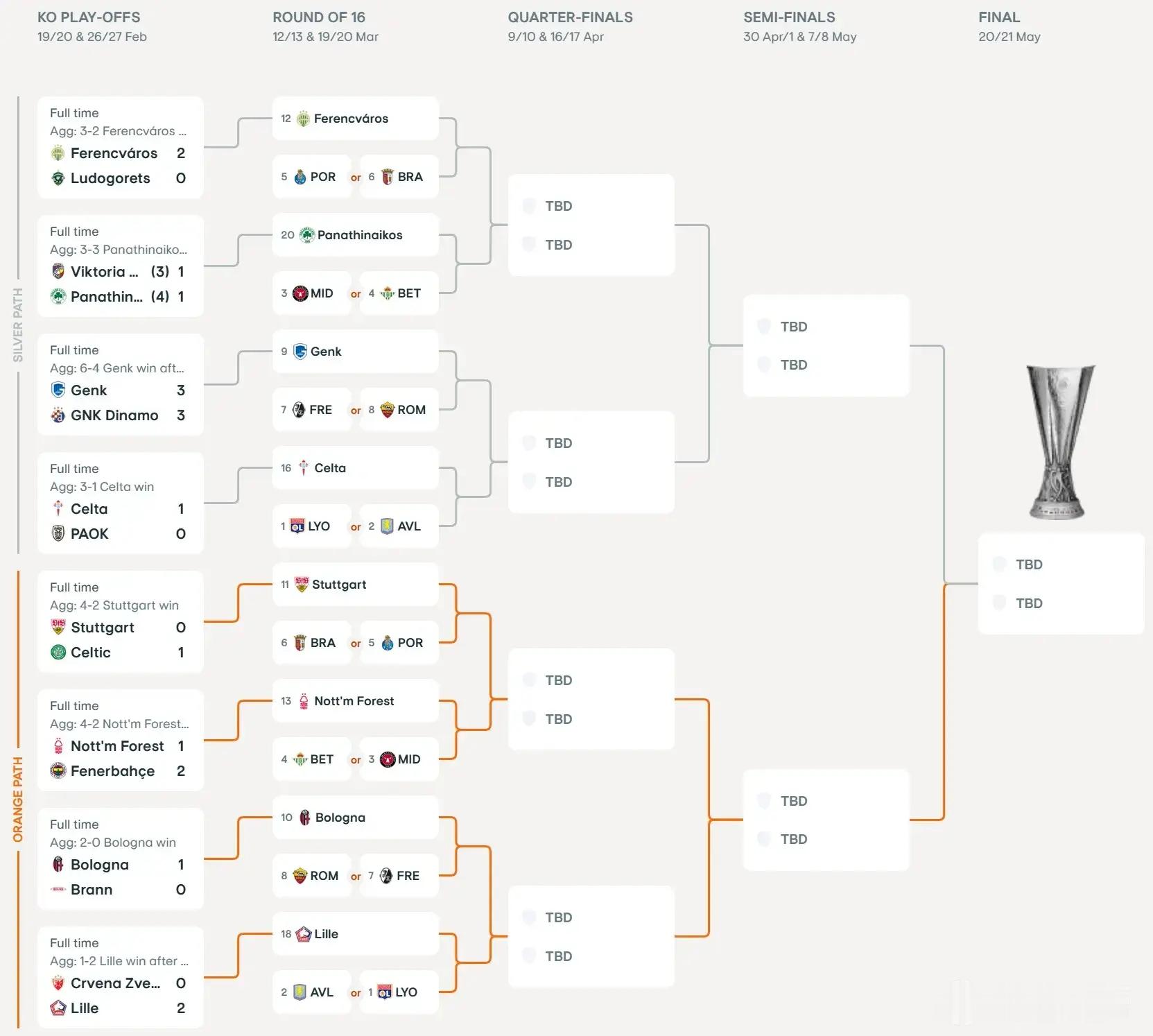 欧联杯淘汰赛附加赛战罢,八支突围球队尘埃落定。经过两回合激烈角逐,费伦茨瓦罗斯、帕纳辛奈科斯、斯图加特、里尔、亨克、塞尔塔、诺丁汉森林与博洛尼亚成功锁定16强席位。英超方面同样传来捷报——水晶宫与诺丁汉森林双双告捷,前者跻身欧协联16强,后者则闯入欧联杯下一阶段。至此,本赛季出征欧战的九支英超球队悉数过关,集体晋级各自赛事的淘汰赛,展现了英格兰足球在欧洲赛场的整体竞争力。欧联杯1/8决赛潜在对阵里昂/阿斯顿维拉vs里尔/塞尔塔罗马/弗赖堡vs博洛尼亚/亨克皇家贝蒂斯/中日德兰vs帕纳辛奈科斯/诺丁汉森林波尔图/布拉加vs费伦茨瓦罗斯/斯图加特欧联杯