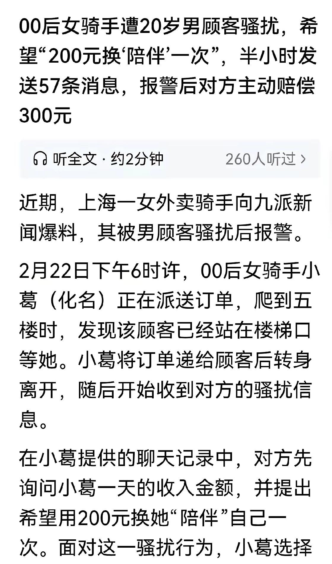 00 后女骑手遭男顾客"200 元买陪伴”骚扰,半小时狂轰 57 条消息!她反手一个操作,结局极度舒适! “现在的 00 后真是越来越不像话了!”这话若是放在以前,或许是长辈对晚辈的无奈调侃。但在上海发生的这起事件中,这句感叹却成了对一位 00 后女骑手最硬核的赞美。面对赤裸裸的性骚扰和金钱侮辱,她没有选择忍气吞声,更没有因为对方是“老乡”而心软,而是用一记漂亮的“回旋踢”,给所有试图挑战底线的人上了一课。 事情发生在 2 月 22 日的傍晚,上海的夜色刚刚笼罩城市,街头巷尾亮起了万家灯火。一位年轻的 00 后女孩,为了多挣一份收入,选择了在下班后化身外卖骑手。寒风中,她穿梭在高楼大厦与老旧弄堂之间,用汗水换取生活的底气。当晚六点多,她接到了一个送往某老旧小区的五楼订单。那是一栋没有电梯的老楼,对于争分夺秒的骑手来说,爬楼梯意味着体力的双重消耗。 当女孩气喘吁吁地爬到五楼,将热腾腾的餐食递到一位二十多岁的男顾客手中时,她只想尽快赶往下一个站点。然而,令她万万没想到的是,这场正常的交易,竟成了噩梦的开始。 就在她转身下楼不久,手机突然震动起来。打开一看,发信人正是刚才那位男顾客。对方开口便是一句轻浮的“姐”,紧接着画风突变,开始打探她的隐私:“你送到几点?一天能挣多少钱?”女孩心中虽有疑惑,以为对方是想入行打听行情,便礼貌回应。可下一秒,对方露出的獠牙让她瞬间血涌上头。 男子直言不讳地提出:"200 块钱,换你‘陪伴’一次。嫌少的话,300 也行。” 这一刻,空气仿佛凝固。在男子眼中,这位凭劳动吃饭的女孩,似乎成了可以随意标价的商品。这种将人格尊严踩在脚底、用几百元钱肆意侮辱的行为,彻底激怒了女孩。她愤怒地没有回复,只想尽快完成工作远离这个恶心的人。 但男子的疯狂远超想象。在随后的半个小时里,他的消息像炸弹一样接连轰炸,整整 57 条!屏幕上不断跳动的骚扰信息,不仅充满了不堪入目的言语,更严重干扰了女孩的骑行安全。在一次查看手机的瞬间,一辆汽车擦身而过,女孩差点被撞飞。生死一线间,恐惧转化为了决绝的怒火。 送完最后一单,女孩没有丝毫犹豫,直接拨通了报警电话。 警方介入后,调查结果令人唏嘘又解气:这名嚣张的男子竟然是女孩的 05 年老乡!面对警察的询问和女孩坚定的指控,男子瞬间没了之前的猖狂。女孩当场表态:“我不要额外的赔偿,我只要他受到应有的惩罚!”她的态度强硬而清晰:做错事,必须付出代价。 最终,在警方的调解下,男子认识到事态的严重性,主动提出赔偿 300 元并道歉。女孩收下了这笔钱,但这绝非为了贪财,而是为了让对方明白:你的行为是有成本的,我的尊严是无价的。 这起事件之所以能引发全网热议,不仅仅因为情节的恶劣,更因为这位 00 后女孩展现出的“硬骨头”精神。在现实生活中,无数女性在遭遇类似骚扰时,往往因为害怕麻烦、担心名誉受损或是抱有“多一事不如少一事”的心态而选择沉默。殊不知,这种隐忍恰恰助长了施暴者的气焰,让他们觉得女性是可以随意拿捏的软柿子。 这位女骑手用行动证明:职业没有贵贱之分,送外卖同样值得尊重;尊严不容践踏,面对恶意必须果断反击。她没有被“同乡”的情面绑架,也没有被“家丑不可外扬”的旧观念束缚,而是拿起法律武器,给了骚扰者最沉重的一击。 根据《治安管理处罚法》第四十二条规定,多次发送淫秽、侮辱、恐吓或者其他信息,干扰他人正常生活的,可处五日以下拘留或五百元以下罚款;情节较重的,处五日以上十日以下拘留。该男子半小时发送 57 条骚扰信息,已涉嫌违法,等待他的将是法律的严惩。 这位 00 后女孩的勇敢,如同一束光,照亮了那些躲在阴暗角落里的丑陋心思。她告诉我们:面对不法侵害,沉默不是金,反击才是对自己最好的保护。愿每一位劳动者都能被温柔以待,愿每一次勇敢的发声,都能换来正义的回响。 对于这位硬核女骑手的做法,你怎么看?欢迎在评论区留言讨论!街头性骚扰 女孩骚扰男孩 对女孩骚扰 素材来源:大风新闻