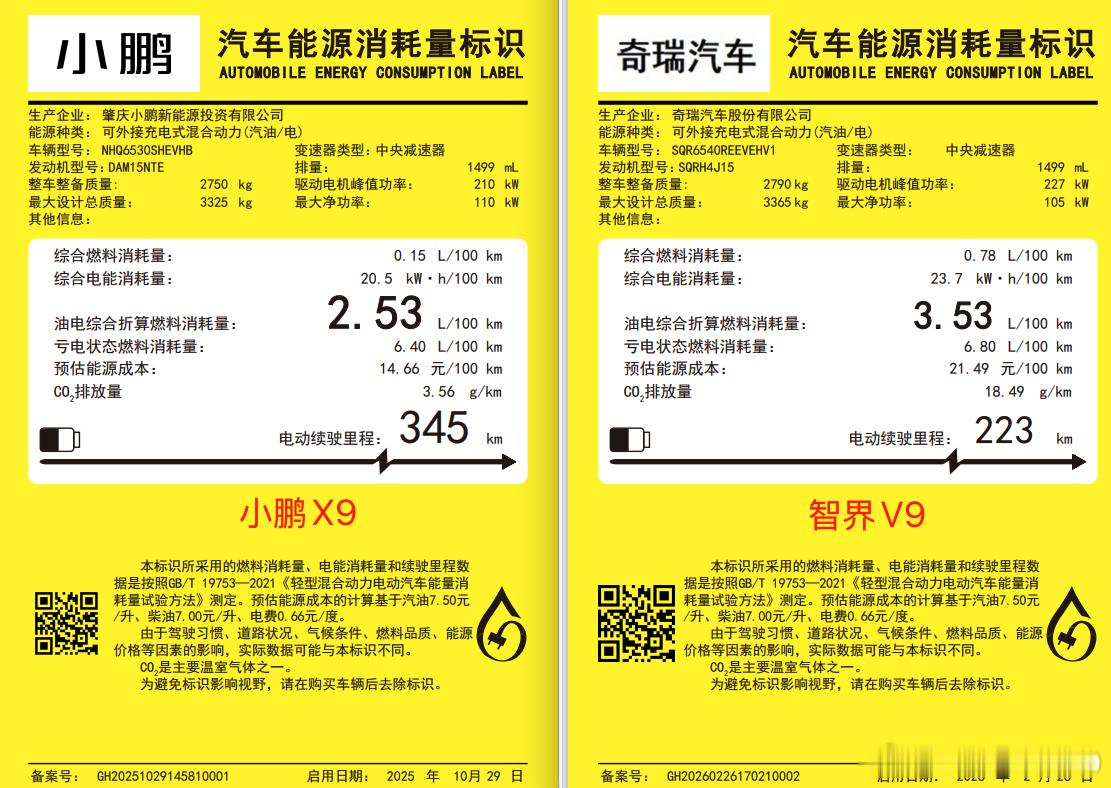 新鲜出炉的智界V9工信部能耗标识