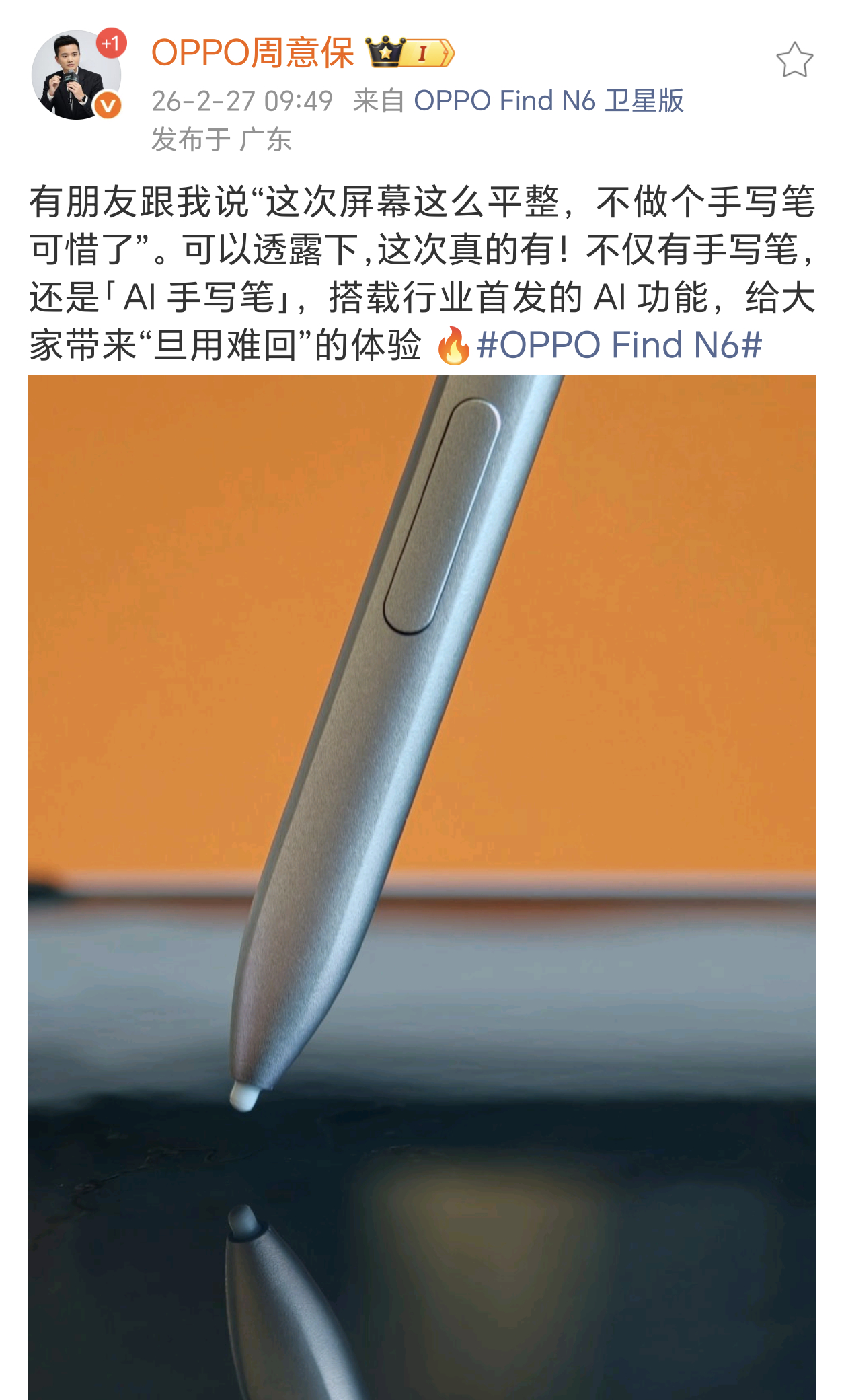 OPPO Find N6确定了,这次OPPO Find N6还配备了一根「AI手写笔」。屏幕平整,再加上手写笔,折叠屏轻办公也更方便了。