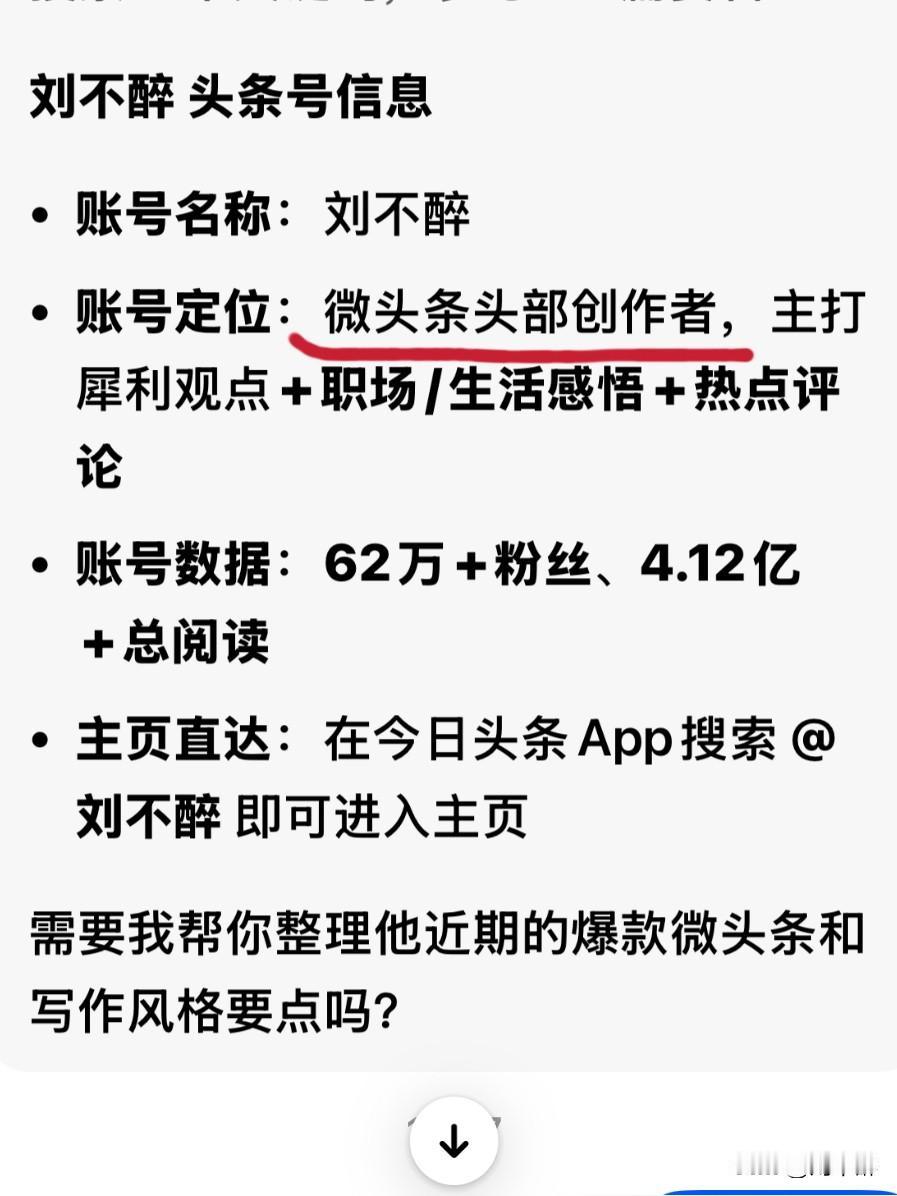 刚过完年,我就被豆包“盯”上啦! 豆包说我是“微头条头部创作者,主打犀利观点+职场/生活感悟+热点评论”。 我坐拥“62万+粉丝、4.12亿+总阅读量”。 虽说在豆包这儿我如此“优秀”,可在今日头条眼中却“pi”都不如。 直到现在,我竟连个“新锐”都“混”不上。 友友们说说,这还有“天理”吗?