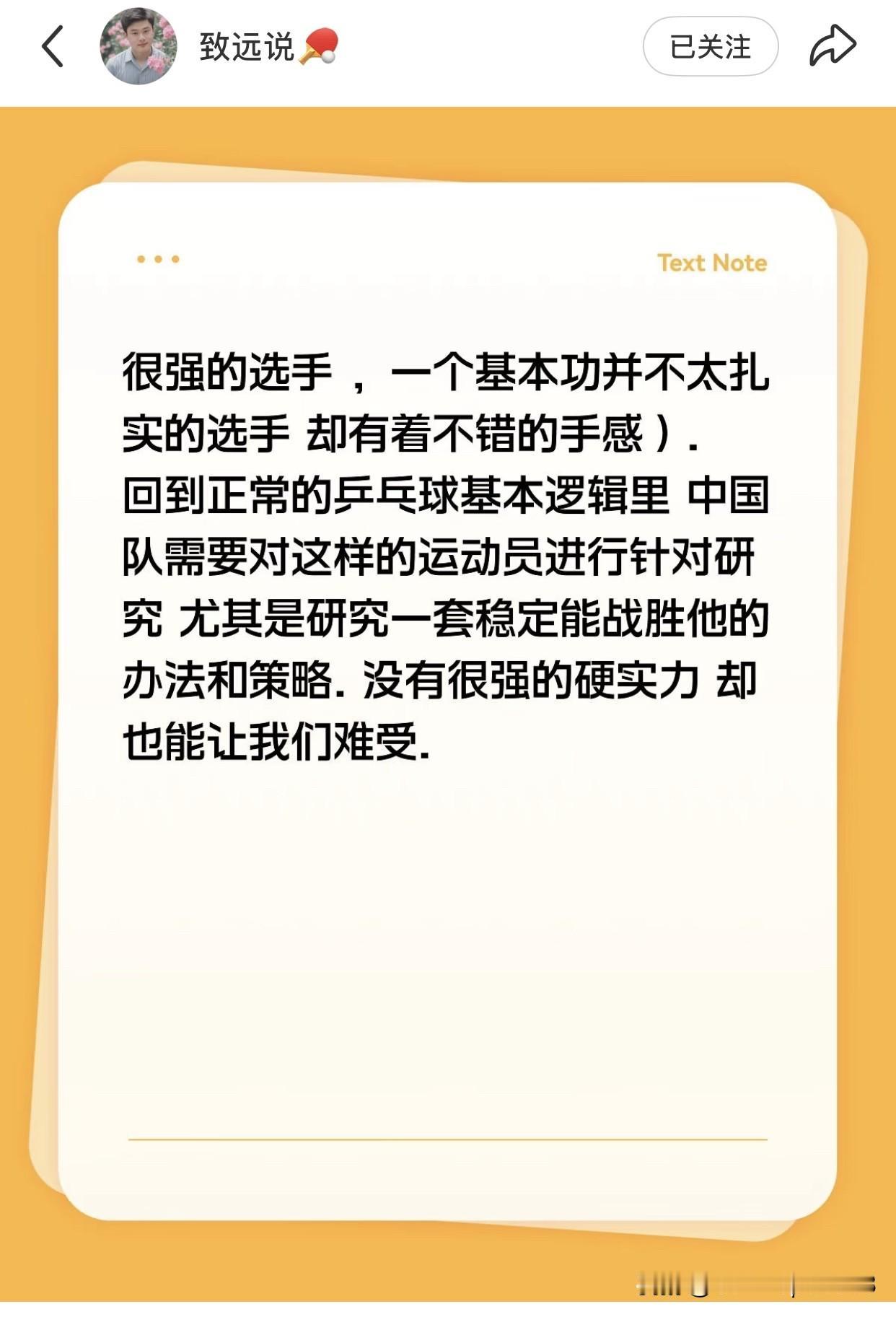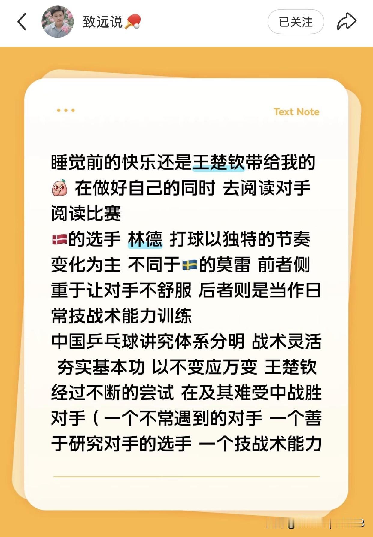 致远复盘王楚钦和林德的比赛,句句扎心, 网友:一个正规军遇到街头小混混,应该如何去打。 林德没有很强的硬实力,但是他却让国乒很难受, 他的特点是:善于研究对手,基本功不扎实,技战术能力强, 网友再给加一条:赖赖呼呼,还有点脏。 乱节奏,搞心态,这就是他的战术。 这场比赛,万幸的是, 王楚钦灵活多变,看第三局1:7之后的追分,每一个球打法都不同; 王楚钦经过磨练心态比以前稳定了很多; 王楚钦基本功扎实,有底气,沉得住气。 换其他人,遇到这样的林德,可能就送了。 ww说,林德是最了解王楚钦的人,可见做了多少准备,做了多久准备, 所以,比赛输掉之后,林德哭了。 国乒也应研究一下此类选手,做到知己知彼。
