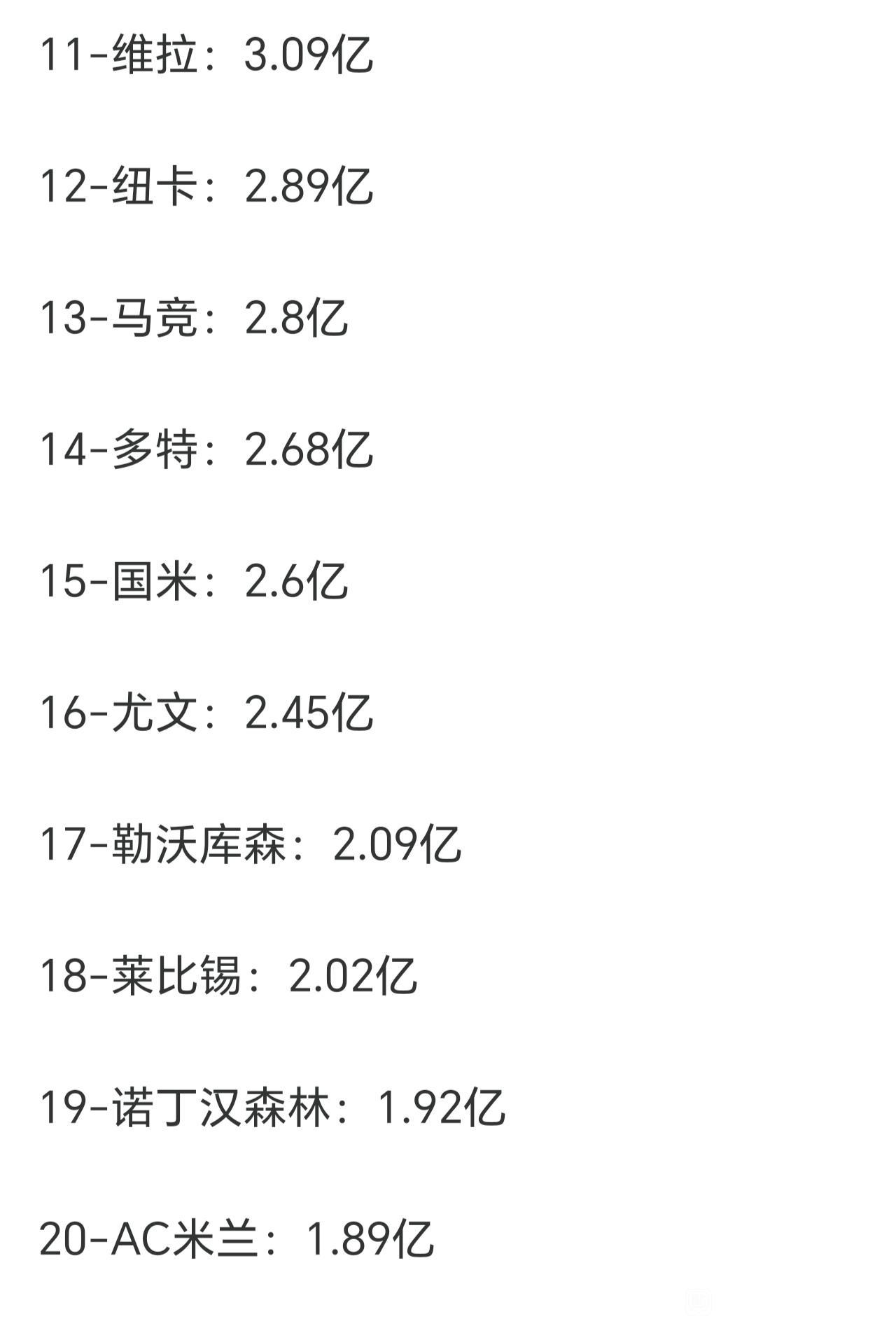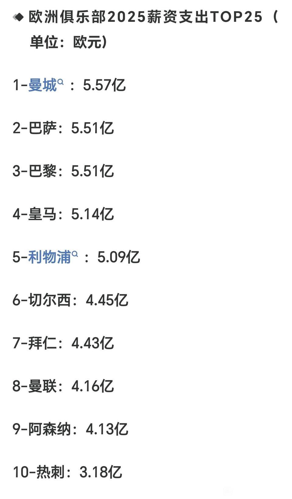 薪资水平反映了某些豪门的窘迫。 Ac米兰才排名第20,还不如英超保级队诺丁汉森林,红黑军团一直在吃老本。 曼城绝对第一,人家就是有钱。 英超球队太有钱,制霸欧洲,欧冠个个都牛。[大金牙]