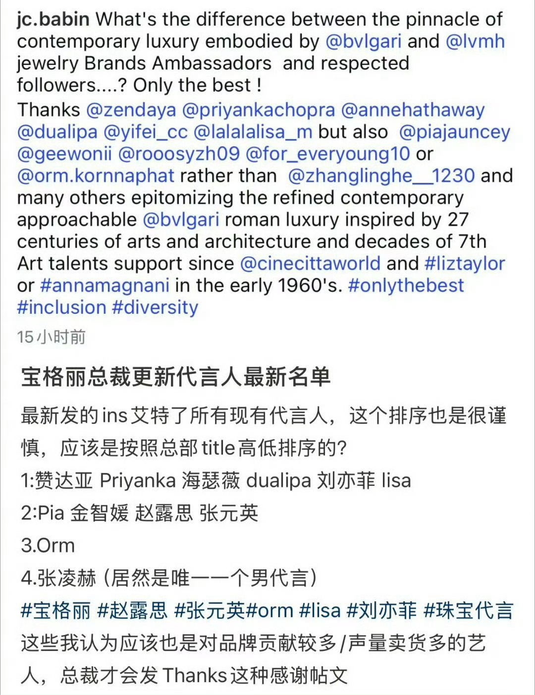 宝格丽代言人名单宝格丽的总裁在ins上艾特了现有所有代言人表示感谢!【赞达亚、Priyanka、安妮海瑟薇、dua lipa、刘亦菲、Lisa、Pia、金智媛、赵露思、张元英、orm_kornnaphat 、张凌赫 】,不得不说总裁艾特的这个先后顺序也很有讲究了。