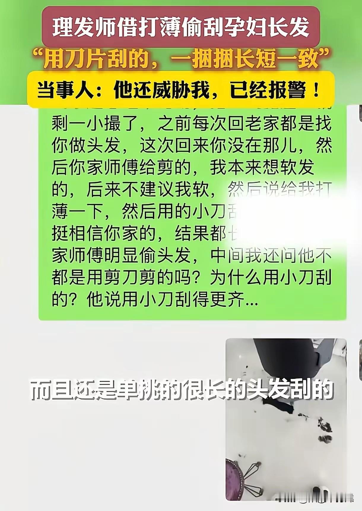 河南驻马店,女子去理发店护理头发,理发师却说女子怀孕了,孕期不能软发,建议女子打薄。女子听劝,可没想到,理发师竟然用刀片贴着头皮刮长发,女子懵了:自己养了5年的头发,第一次看到用刀片刮的,并且刮下来的头发还是长短一致,一捆捆摆放整齐的,她怀疑店家别有心思。可理发师却说这样刮的比较整齐,女子拍下照片后,发给从事美发行业的弟弟看,确认对方就是恶意偷刮长发拿去卖钱,找到店家,可店家的态度却让人难以接受。 2月24日,张女士去理发店做软发,想着让头发更加软顺,好打理一些。 那天她特意挑了常去的那家店,进门就跟熟悉的托尼老师说想做个软发,结果对方不在,店里另一个师傅接待了她。那师傅一上手就皱着眉,说她现在怀着孕,软发剂里的化学成分对胎儿不好,劝她别做。张女士一听也慌了,自己确实刚查出来怀孕没多久,就问那怎么办。师傅一拍胸脯,说那就打薄吧,不伤头发还显清爽,她没多想就点头了。 接下来的操作让张女士彻底懵了。那师傅没拿剪刀,反而掏出了一把明晃晃的长刀片,就这么贴着她的头皮往下刮。她当时就坐直了,问他怎么不用剪刀,师傅头也不抬,说用刀片刮得更齐,效果更好。张女士心里犯嘀咕,但想着人家是专业的,就没再多问。直到她余光瞥见地上的头发,心一下子沉了——那不是碎发,是一捆捆长短一模一样的长发,码得整整齐齐,根本不是正常打薄会掉的头发。 她赶紧掏出手机拍了照,发给在外地做美发的弟弟。弟弟一看照片就炸了,说这哪是打薄,这是明着偷头发!正常打薄用的是牙剪,只会剪出碎发,只有卖头发才会用刀片贴着头皮刮,这样收来的头发才能卖上好价钱。张女士听完浑身发冷,自己这头长发养了整整五年,从及腰养到快到屁股,平时连分叉都舍不得剪,就这么被人刮走了一大半。 她拿着照片去找店家理论,没想到对方的态度比刀片还冷。一开始还嘴硬说就是正常打薄,后来看她拿出弟弟的专业说法,又换了副嘴脸,说“不就是点头发吗,给你免单行了吧”。张女士气到发抖,说自己要的不是免单,是一个说法,是他们偷头发还威胁人的道歉。结果那师傅直接拍了桌子,说她“没事找事”,还放狠话“再闹就让你走不出这个店”。 张女士没被吓住,当场就报了警。警察来了之后,店里才松了口,承认确实是用刀片刮了头发,但又说“行业里都这么干”,还说张女士小题大做。可张女士清楚,这根本不是行业惯例,是赤裸裸的欺诈和盗窃。她养了五年的头发,承载的是自己的心血和审美,不是店家牟利的商品。 这件事让我想起之前刷到的新闻,有些理发店会专门盯着长发女生,用“打薄”“做护理”的名义偷剪头发,然后拿去卖钱。那些头发少则几百,多则上千,对他们来说是无本买卖,可对顾客来说,那是几年的心血。更让人寒心的是,他们还会利用孕妇、老人这些群体的信任,先以“安全”“健康”为借口打消顾虑,再下黑手。 我甚至能想象到张女士当时的心情。从一开始的信任,到发现不对劲的疑惑,再到确认被偷后的愤怒和委屈,最后被威胁时的无助。她只是想做个头发,却成了别人砧板上的肉。而店家从头到尾没有一丝愧疚,反而觉得自己理直气壮,这种扭曲的价值观才是最可怕的。 现在张女士的头发已经没法恢复了,只能慢慢养。她把这件事发到网上,就是想提醒所有女生,去理发店一定要多长个心眼。别轻信所谓的“专业建议”,尤其是涉及到动你头发的操作,一定要问清楚用什么工具、会剪成什么样。如果发现不对劲,立刻叫停,别像她一样,等头发被刮走了才反应过来。 各位读者你们怎么看?欢迎在评论区讨论。