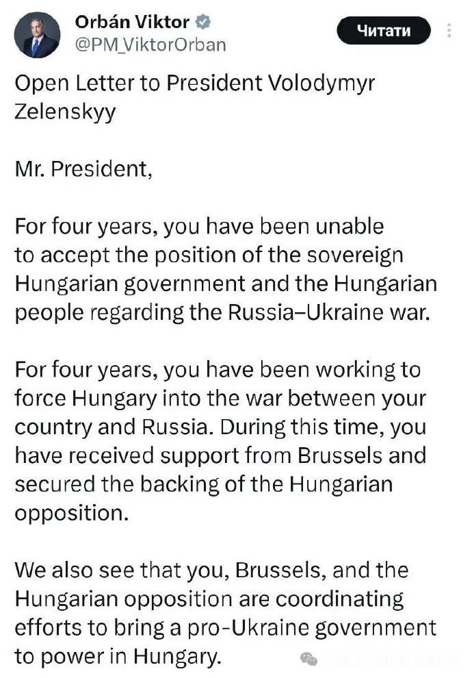 不过,就在斯洛伐克总理菲佐下令停止向乌克兰提供紧急电力、Politico发文后,欧尔班却让步了,选择向乌克兰示好,欧尔班在社交媒体上发表了给乌克兰总统泽连斯基的公开信:“我呼吁你立即开放‘德鲁日巴’输油管道),并停止任何进一步损害匈牙利能源安全的行为。请对匈牙利表现出更多尊重!”