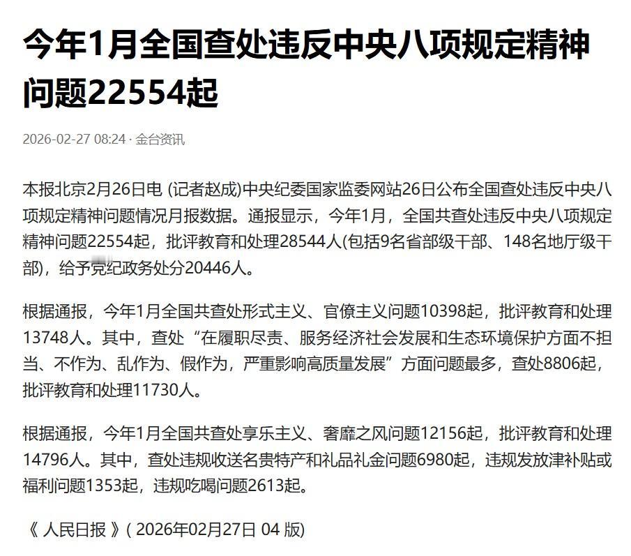 与违反八项规定的现象作斗争不是一天两天的事情,而且也不是短时间就能根治的事情,必须要有长久的决心和意志。在当前如此严的情况下,还有超2万多起、近5万党员干部受处理,可见问题的根深蒂固。刚刚过去的春节,各级都有明查暗访,估计受到处理的人和事更多。尤其对于贪污受贿和大吃大喝,一定要从严查处!