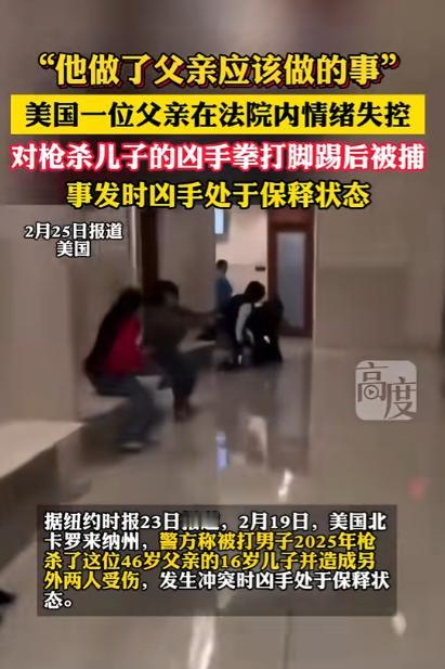 美国父亲法庭暴打杀子仇人,而他只是做了身为父亲该做的事,2月19日美国北卡罗来纳州的一家法院里,发生了一件让全网破防的事。 2 月 19 日,美国的地方法庭内,本该按流程推进的保释听证会突然彻底失控,一位丧子父亲当场冲向杀害自己儿子的嫌疑人。 挥拳痛殴的画面被现场镜头完整记录,这段视频传到网络后,短短 24 小时内全球播放量直接冲破 5200 万,登上全美社交平台热搜榜首,无数普通网友看完都直言破防,大家心里都清楚,这位父亲只是在极致的绝望里,做了无数人心中身为父亲会做的事。 这位失控的父亲夏希姆现年 47 岁,是当地一名从业超 22 年的建筑从业者,常年的体力劳作让他有着普通工人的结实身板,生活里他沉默寡言,所有的心思都扑在家庭和唯一的儿子身上。 他的儿子贾马里耶遇害时年仅 16 岁,是当地高中的高二学生,平时热爱篮球运动,在同学和邻里眼中是性格温和、没有不良嗜好的少年,这样一个正值青春的孩子,却永远离开了深爱他的父亲。 事发当晚十点半左右,贾马里耶与两位同伴在街边便利店外停留,与 21 岁的马里昂・麦克奈特发生言语争执,这场不起眼的口角最终演变成致命悲剧。 马里昂直接掏枪射击,贾马里耶胸部中枪,当场失去生命体征,同行的两位同伴也不同程度受伤。 警方通过现场监控、目击者证词快速锁定马里昂为嫌疑人,其与贾马里耶曾是短期同事,此前因工作琐事产生矛盾,此次属于蓄意报复,警方随即以一级谋杀罪、两项故意伤害罪对马里昂提起指控。 按照正常司法流程,一级谋杀属于重大暴力犯罪,嫌疑人理应被羁押等待审判,可北卡罗来纳州 2025 年 12 月才正式推行的《伊丽娜法案》,本意是严格限制暴力重罪的保释资格,却被马里昂的辩护律师抓住漏洞。 律师以马里昂无犯罪前科、属于初犯、警方核心定罪证据尚未完全完善为由申请保释,法官最终批准了这一申请,将保释金额定为 50 万美元,马里昂的家属多方筹措资金缴纳后,这个枪杀未成年少年的凶手,竟以保释状态走出看守所,出席这场保释听证会。 凶手能轻松保释的消息间击垮了这位隐忍已久的父亲,他整夜守在儿子的遗像前,没有合过一眼,第二天清晨,他揣着儿子的学生证和全家福,独自前往法院,只想亲眼看着司法给出公正的结果。 听证会开始前,马里昂在法警陪同下出现在法庭走廊,他神情淡然,毫无愧疚之意,甚至还在和律师低声交谈。 这一幕彻底点燃了夏希姆压抑许久的情绪,他不顾现场安保的阻拦,用尽全身力气冲上前,将马里昂扑倒在地,攥紧拳头狠狠砸向对方,情绪激动到全身颤抖,嘶吼声回荡在整个法庭。 现场多名法警合力才将夏希姆拉开,被控制时他依旧挣扎着想要靠近凶手,嘴里反复喊着对儿子的思念与不甘。 视频发酵后,美国民间舆论呈现一边倒的态势,相关民意调查显示,超过 85% 的网友表示理解这位父亲的行为,认为其崩溃情有可原。 这样的案例在美国并非个例,2023 年德克萨斯州就曾发生类似事件,一位丧女父亲在法庭内袭击杀害女儿的凶手,同样获得了大量民众的同情。 而背后更残酷的是数据支撑,2025 年美国全年未成年人因枪击暴力死亡人数突破 1800 人,北卡罗来纳州就占据 7.2% 的比例。 当地暴力重罪嫌疑人保释后二次犯罪的概率达到 12%,枪支泛滥和司法流程中的漏洞,才是催生这类悲剧的根源。 没有人需要为这位父亲的行为做过多评判,大家看到的只是一个失去孩子的父亲,在公平迟迟未到的时候,用最原始的方式宣泄着丧子之痛,法庭上的拳打脚踢不关乎暴力,只关乎一个父亲再也护不住孩子的绝望。 美国每年数千起未成年人枪击案背后,都是无数个破碎的家庭,夏希姆的遭遇只是其中一个缩影,这段法庭视频之所以能引爆全网,不是因为冲突本身,而是每个为人父母者,都能在他身上看到那份刻入骨髓的心疼与无力。 对于这件事,您有什么想说的吗?欢迎评论区留言讨论。 信源:高度新闻2026-02-26——《“他做了父亲应该做的事”,美国一位父亲在法院内情绪失控,对枪杀儿子的凶手拳打脚踢后被捕……》