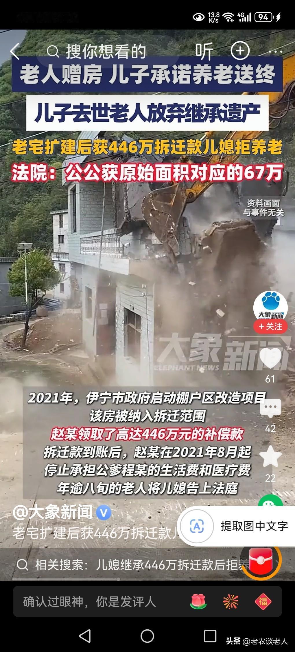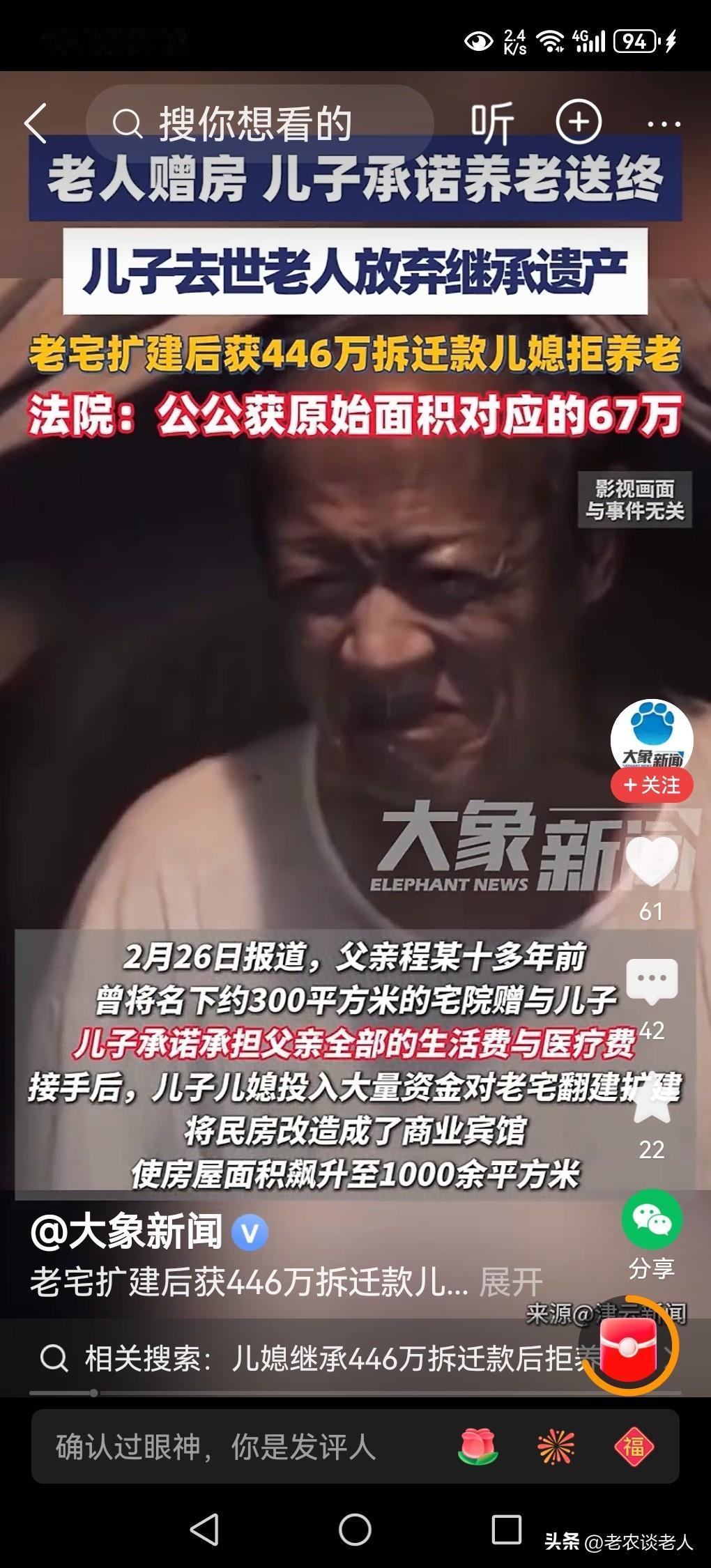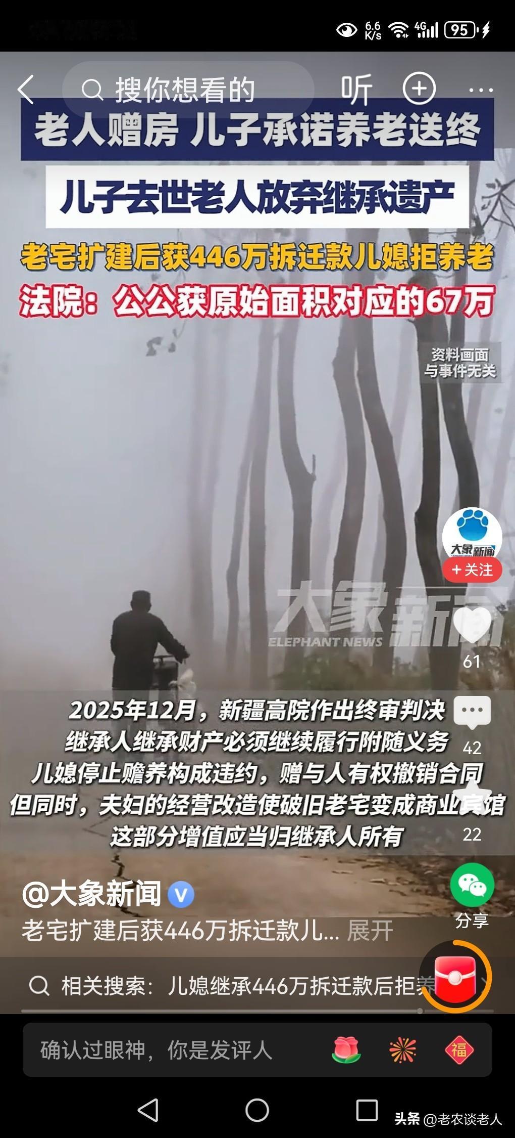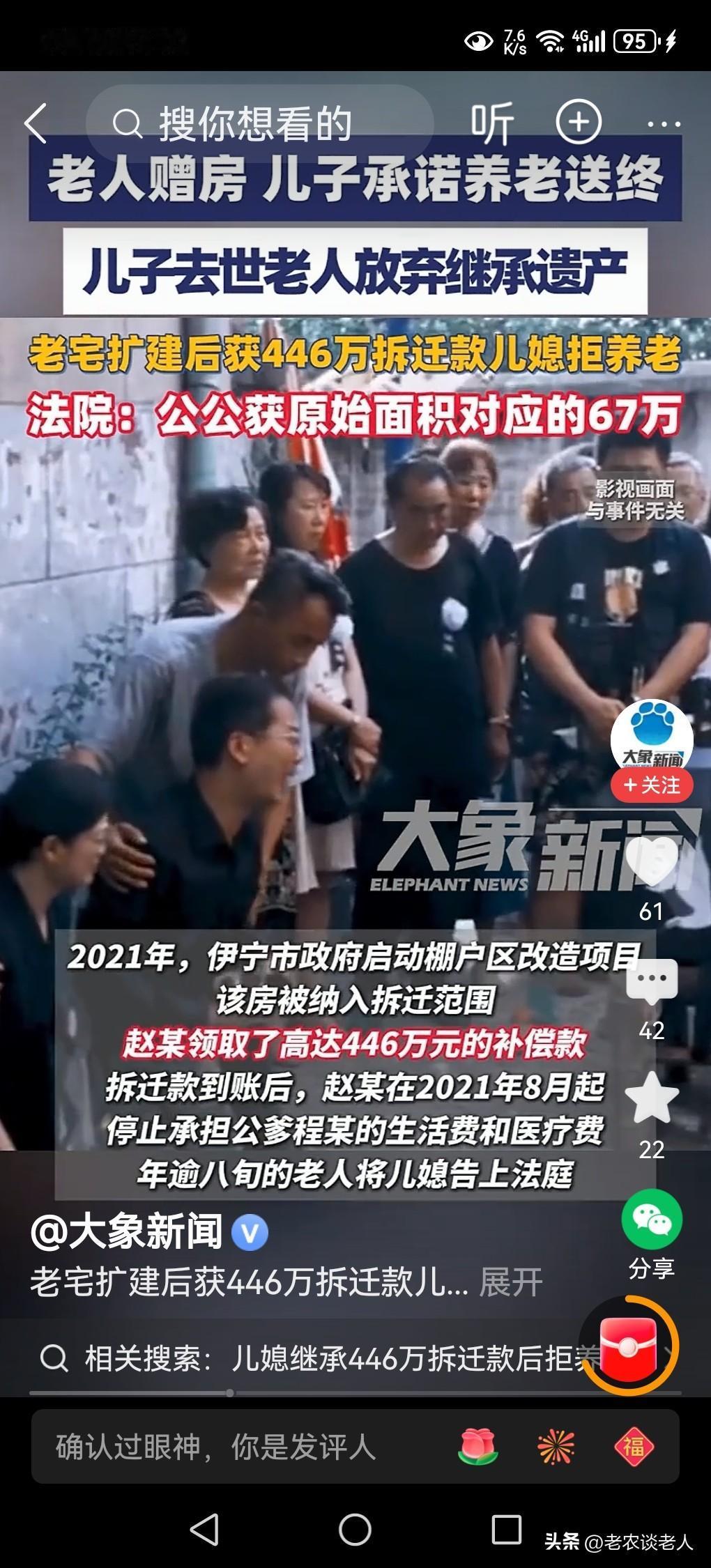 儿媳继承446万拆迁款后拒养公公! 养儿防老,是传统的养老模式,已经存在了几千年的历史,现在由道德和法律双重形式已经固定下来了,成为我国普通人养老的基本形式。 有的老人为了自己晚年的生活和健康,为了自己的养老,把自己居住的房子一半赠与子女,成为子女赡养老人的基本资源和条件。 因此,子女得到了父母的赠与房屋以后,必须无条件的为自己的父母养老送终,是无可挑剔的,是无可厚非的,也是名正言顺的,道德和法律责任和义务。 据媒体2月27日报道,新疆八旬老人多年前将300m2宅院赠给儿子,约定承担父母的生活费和医疗费。儿子夫妻接赠后,又投入资金扩建房屋至1000余平方米,改造成为商业宾馆 。到2020年,儿子突然去世,老人放弃继承房屋,由儿媳及孙辈继承房产 。又到2021年,因房屋拆迁,儿媳领到446万补偿款后,翻脸拒绝支付老人的生活费和医疗费,停止赡养。老人在无可奈何的情况下,将儿媳告上法庭。 法庭依法认为,受赠人不履行约定义务,赠与人可撤销赠与,通过审理儿媳所出示证据证明房屋扩建,认为是夫妻共同投入,增值部分应归儿媳所有,同时还认定原始宅院老人与儿媳各占一半,对应补偿费用是67万元,并且儿媳应承担老人养老责任。 透过此案例回到我们的现实生活中来,本人认为,子女继承老人的遗产,一定要履行职责,承担老人生活费用和医疗费用,承担赡养老人的责任,为老人尽职尽责养老送终,承担全部的养老责任,是法律赋给继承人的法律和道德的责任,是责无旁贷,无法推卸的责任。 本人认为,这宗案件涉及到,该儿媳继承财产,就需要履行附随义务,若是该儿媳妇停止赡养老人,拒绝为老人养老送终,就构成违约,于情于理于法都是相悖的,都是错误的,都是不应该的,必然要接受法律的判决的结果。 本人认为,儿媳妇既然拿到了拆迁款后,又拒绝给老人养老送终,是极其不合情理的,法庭判决必然会兼顾法理人情,该被告人既获得继承遗产权益,就必须要履行赡养老人,为老人养老送终的职责。 本人的观点是,该儿媳妇有两种选择,一是要获得老人的房屋继承权利,就必须要履行继承遗产的附加条件,要为老人要承担所有的生活费用和医疗费用,要赡养老人,要为老人养老送终。 二是该儿媳妇不愿意赡养老人,停止支付老人生活费用和医疗费用,拒绝为老人养老送终,那么就要放弃老人赠与的房屋继承所有权利,只能得到夫妻共同扩建房屋所获得的拆迁补偿款,无法继承老人房屋的拆迁款,并且该拆迁补偿费用一律全部由老人获得所有,该儿媳妇就没有任何的赠与房屋财产拆迁补偿的权益。 以上是本人观点,如有不妥,请大家在留言区中留下你宝贵的意见,并积极参与评论,特邀请大家关注房屋继承和赡养老人的问题。