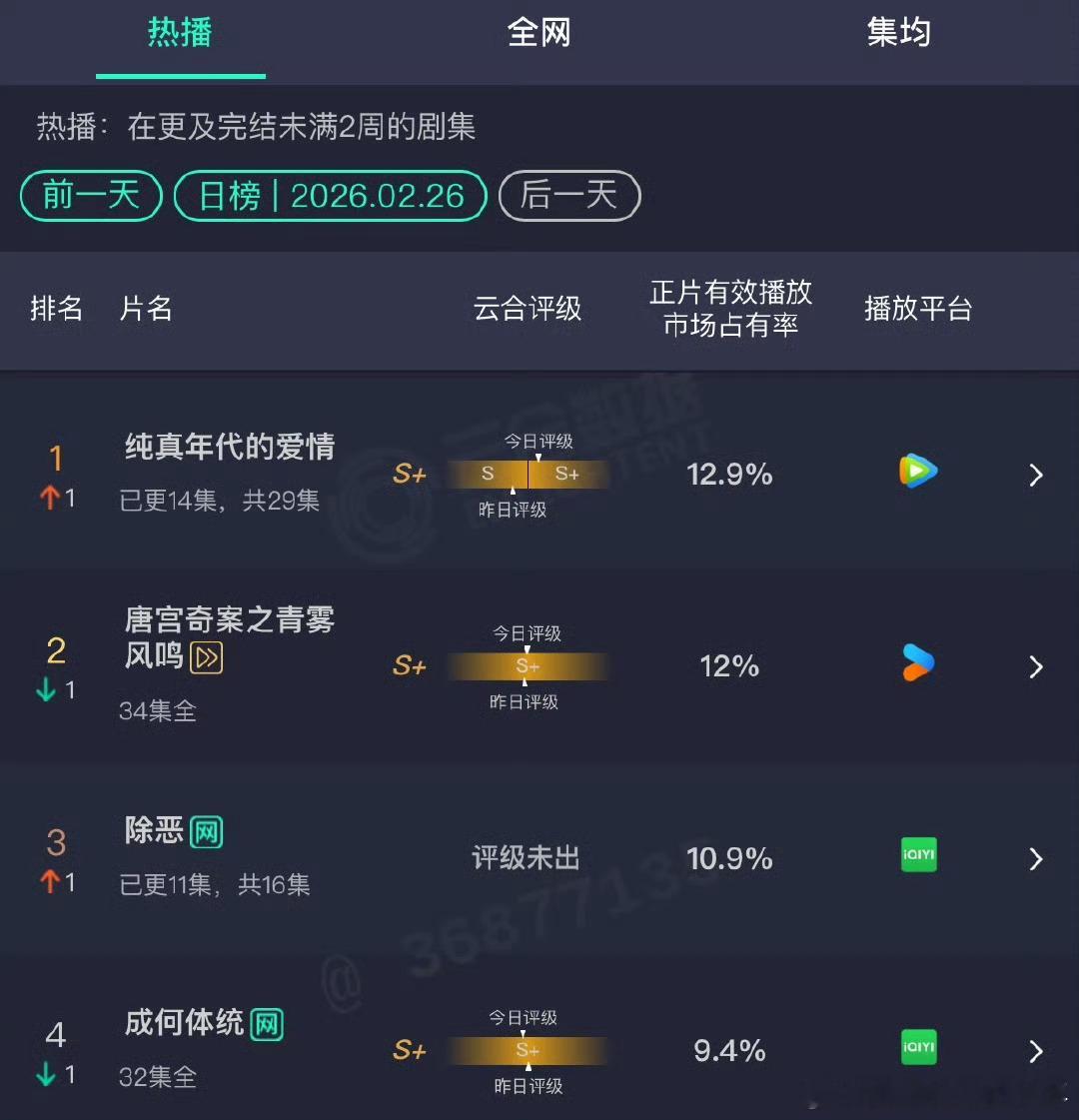 见春天 陈飞宇王影璐都来看陈飞宇的《纯真年代的爱情》!云合登顶了 评级升级至S+,纯真年代的爱情 拉新周榜第一,在播的一个能打的都没有阿瑟伟大 见春天 陈飞宇王影璐