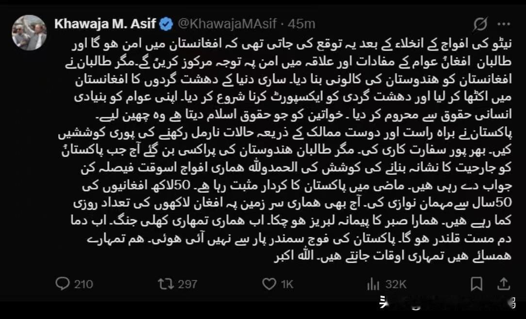 现在双方都指责对方是犹太人走狗…… 当地时间2月27日,巴基斯坦国防部长赫瓦贾·阿西夫在社交平台X上指责阿富汗塔利班政府将阿富汗变成印度的殖民地,成为印度的傀儡,并为恐怖分子提供庇护。 阿西夫表示,巴基斯坦军队正对阿富汗塔利班政府的攻击行为做出坚决回击。他还称,巴基斯坦将与阿富汗进行公开战争(可能说成是宣战)。 “北约撤军后,人们原本期望阿富汗实现和平,塔利班会专注于阿富汗人民的利益和地区稳定。然而塔利班却把阿富汗变成了印度的殖民地。他们(塔利班)把世界各地的恐怖分子聚集到阿富汗,开始输出恐怖主义。他们剥夺了本国人民的基本人权。他们剥夺了女性伊斯兰教赋予她们的权利。巴基斯坦竭尽全力——无论是直接行动,还是通过友好国家施加影响——来维护局势稳定。我们开展了广泛的外交活动。然而塔利班却成了印度的傀儡。如今,当有人试图以侵略手段攻击巴基斯坦时,感谢真主,我们的军队正给予坚决回击。过去,巴基斯坦发挥了积极作用。50年来,我们接纳了500万阿富汗人。即使在今天,仍有数十万阿富汗人在我国谋生。我们(巴基斯坦)的耐心已到极限。现在我们将与你们(阿富汗塔利班政府)展开一场公开的战争。这将是一场血腥的战争。巴基斯坦军队并非来自海外。我们是你们的邻居,我们了解你们的真实处境。”