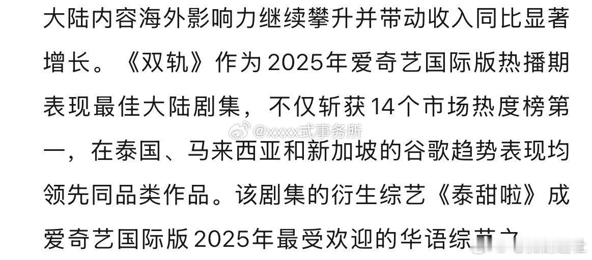 爱奇艺q4财报,海外业务唯一提到的长剧:虞书欣 何与《双轨》作为2025年爱奇艺国际版热播期表现最佳大陆剧集