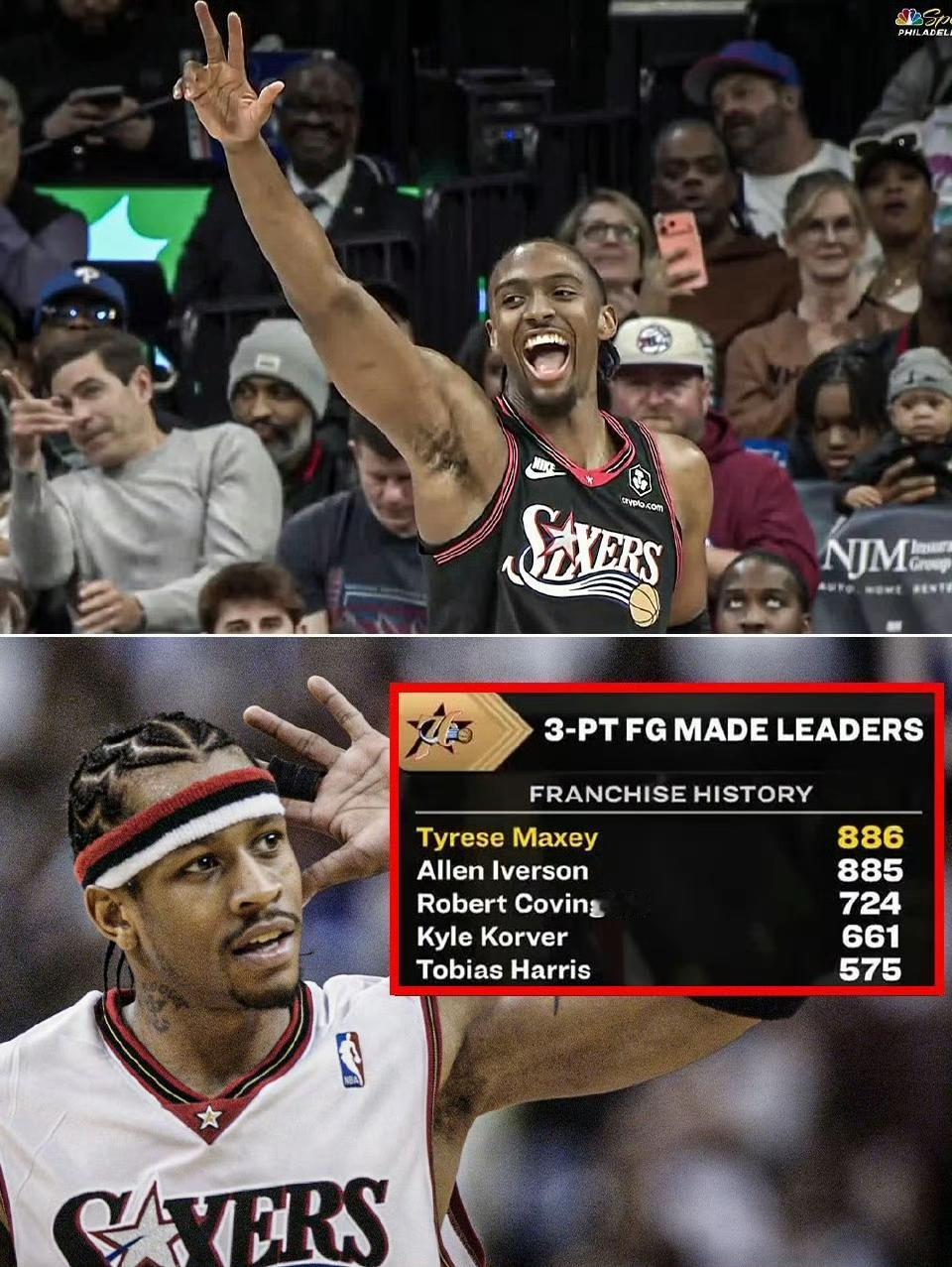 马克西成为76人队史三分第一人!他才25岁!每天都在打破自己的纪录! 艾弗森在76人留下了718场比赛命中885个三分的记录,马克西375场比赛投进887个三分成为队史第一人。