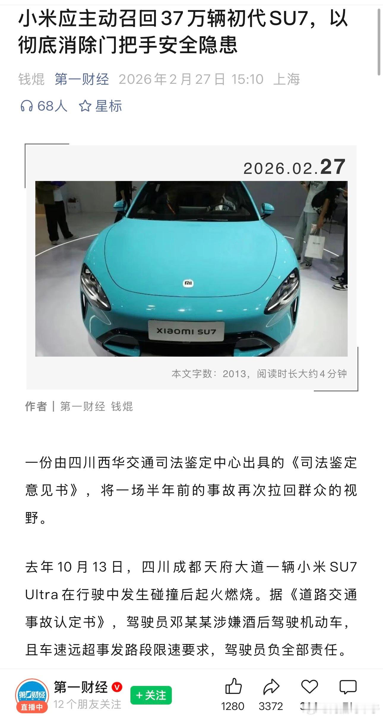 单单小米一个不行,应该号召全行业不能满足新标准的都召回,更换门把以满足新标准。