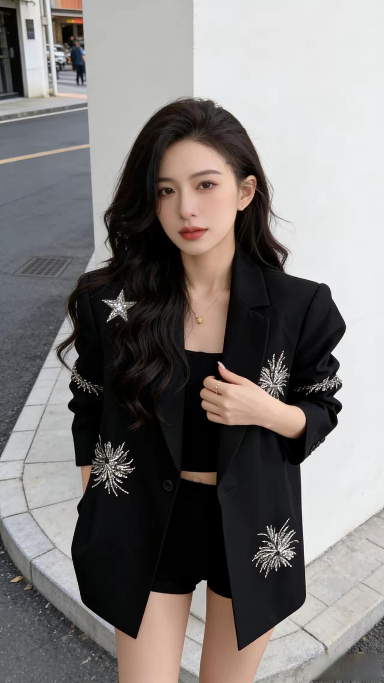 都市时尚风,黑色西装外套搭配短裤,闪耀星饰点缀,优雅自信!💃✨