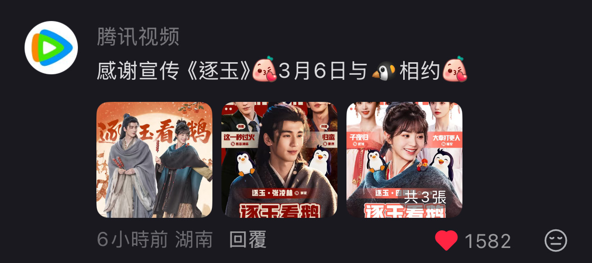没看明白 是两个平台都播还是只有🐧,怎么跑去猕猴桃🥝下面宣传了腾讯感谢爱奇艺宣传逐玉