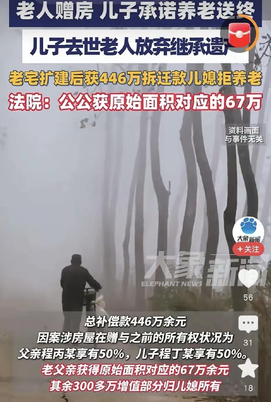 新疆八旬老人将300平米老宅赠与儿子,条件是负责生活费、医疗费、养老送终。儿子扩建房子做宾馆。后儿子离世,儿媳掌家。老宅拆迁,儿媳获得446万拆迁款,却拒绝赡养老人。法院判儿媳给老人67万并履行赡养义务。 儿媳没有赡养公公的义务,但是老人的房子给了儿子儿媳,拆迁款是在老宅的基础上才给的,最终是由儿媳继承,儿媳不赡养老人说不过去。如果你不赡养老人就把拆迁款还给老人。 法官判得对,既给了儿媳应得的利益,又让老人有了傍身的钱,不至于流落街头。