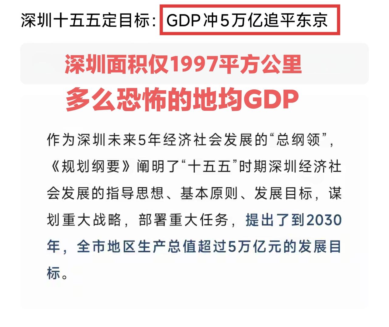 深圳规划了五年后的2030年GDP将达五万亿人民币,要知道深圳面积仅1997平方公里,这个地均GDP实在太强大了。要实现这个目标对深圳来说其实并不难,每年增量2200多亿即可,也就是每年百分之五六的GDP增长率。
