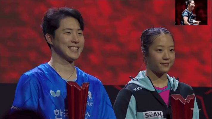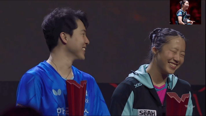 非得笑吗哈哈哈哈哈哈,颁个奖把申裕斌逗得笑不停。 新加坡大满贯,林钟勋申裕斌输给了雨果高桥,获得混双亚军, 今天的发挥,真的要回去好好总结了,发挥的都不好,但是两个人很开心,1400分到手了。 颁奖仪式上,林钟勋又耍宝,咧嘴假笑,一动也不动,申裕斌看一眼,笑的都睁不开眼了。 咱就说,这非得笑吗,是不是不笑也行🤭