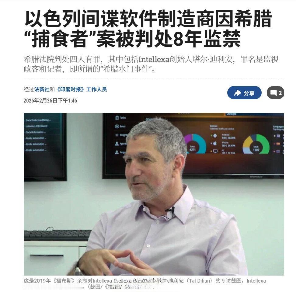 希腊法院就2022年以色列间谍软件“捕食者”被用于对数十名政客、记者、商界领袖和军方官员进行监听的案件(号称“希腊水门事件”)做出判决,缺席判处以色列间谍公司Intellexa的创始人塔尔·迪利安8年监禁,缺席判处迪利安的合伙人萨拉·哈穆以及该公司的两名前希腊籍高管不同时长的监禁。 目前四名犯罪分子都处于自由状态,尚未向希腊法院上诉。
