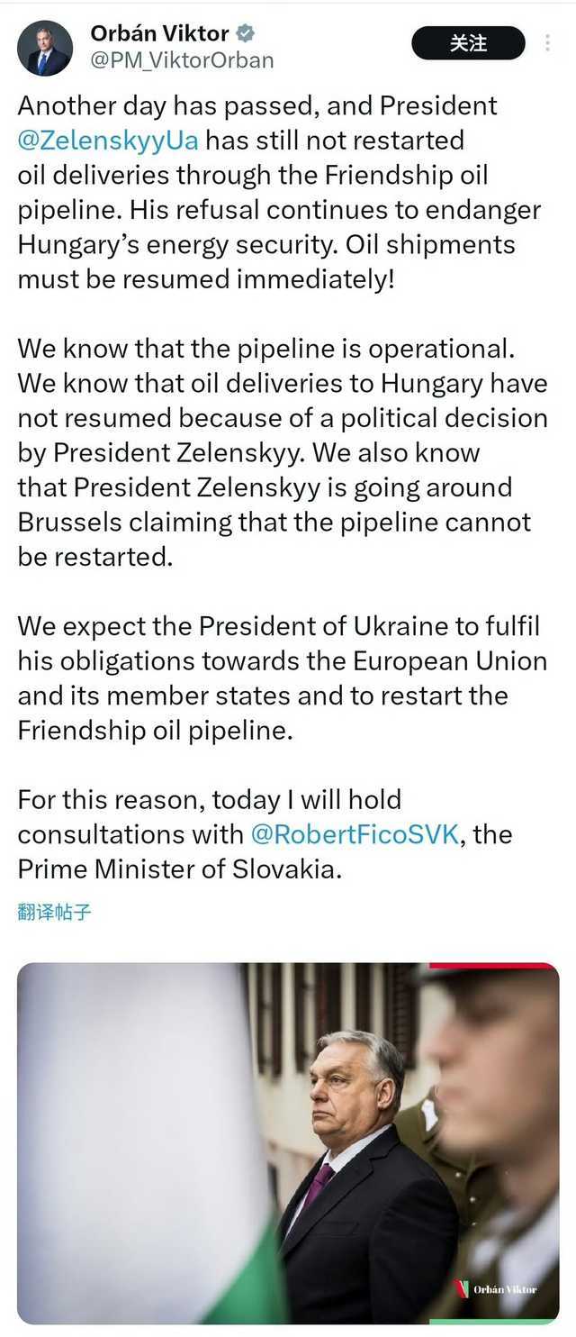 欧尔班:“又一天过去了,而泽连斯基总统仍未恢复通过"友谊"输油管道输送石油。他的拒绝继续危及匈牙利的能源安全。石油输送必须立即恢复!”“我们知道该管道是可运行的。我们知道对匈牙利的石油输送之所以没有恢复,是因为泽连斯基总统的政治决定。我们还知道泽连斯基总统正在布鲁塞尔四处声称该管道无法重启。”“我们期望乌克兰总统履行他对欧盟及其成员国的义务,并重启"友谊"输油管道。为此,今天我将与斯洛伐克总理罗伯特·菲佐进行磋商。”