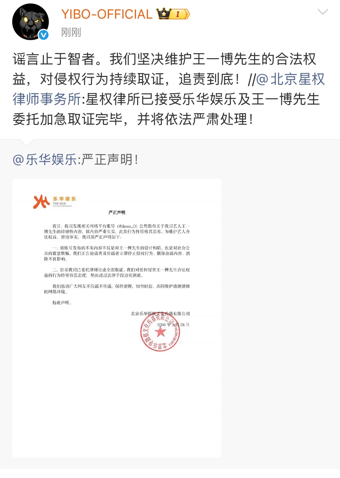 乐华娱乐、王一博工作室辟谣网传聊天记录乐华娱乐声明