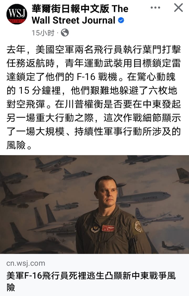 美伊对峙美国《华尔街日报》发文称,去年两名美国空军飞行员驾驶F16战机执行打击也门胡塞武装任务返航时,被胡塞武装雷达锁定,在15分钟内艰难躲避了6枚防空导弹。这次作战的细节表明了军事行动的风险性,在特朗普是否决定对伊朗打击时需要权衡一下这样的风险。