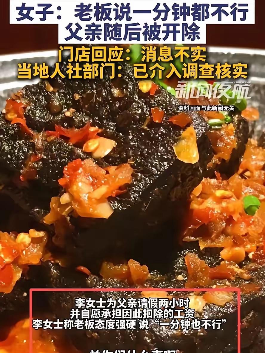 这下事情闹大了!山东济南,女子假期后准备回外地上班,临走前就想着和父亲吃顿饭,于是替父亲和打工的店铺请了两个小时的假,结果店家却说1分钟都不行,还直接把她的父亲辞退,女子直接硬刚到底,来到店前讨要说法。 从杭州返乡的李女士,原想陪父亲吃顿送别饭,弥补春节期间的陪伴遗憾,她特意在夜间九点联系店方,为父亲申请晚间两小时假期,还主动提出扣除工资,态度诚恳又周到。 然而,店铺负责人的回应却冰冷强硬,他不仅直接挂断电话,拒绝了请假请求,更是反手就辞退了李父,没有书面说明,也没有任何经济补偿,这种处理方式,实在让人心寒。 李父在这家小吃店,已辛勤工作近三年,他是炸锅师傅,是核心员工,节假日从未休息,甚至带病上岗,毫无怨言,每日工作十六小时,从早九点到凌晨一点,春节期间,也只在大年三十休息了一天,父女俩仅仅匆匆,吃了一顿团圆饭,这样的老员工,就因为两小时假,被无情辞退,老人内心充满委屈与无措。 李女士得知父亲被辞退后,又气又心疼,次日,她便赶到位于济南历下区宽厚里商圈的店铺,寻求一个说法,她没有过激言行,只是理性沟通诉求,但现场视频,经路人上传网络后,迅速扩散,引发轩然大波。 这起事件,迅速成为全网热议话题,多数网友,纷纷支持李女士维权,痛批商家冷漠至极,他们认为,像李父这样春节无休、长期加班的老员工,仅因两小时请假,就被辞退,这不仅寒了员工的心,也严重损害了店铺的口碑,许多服务行业从业者,也借此呼吁,企业应灵活管理,体谅员工的合理需求。 小姐姐太飒了!这种老板就该硬刚到底啊!这样的声音,在网络上此起彼伏,表达了公众对于员工权益的强烈关注,这不仅是对李女士的支持,更是对所有劳动者,面临不公待遇时,应如何维护自身权益的深切思考。 我认为,一家企业的成功,绝不应只建立在,对员工的无情压榨上,劳动者的付出,理应得到尊重和合理回报,这种缺乏人情味的管理模式,不仅有悖常理,更与当前社会,倡导的和谐劳动关系格格不入。 此事最终,引起了人社部门的关注,并迅速介入调查,这无疑为李女士和李父,带来了维权的希望,面对这种不合理的解雇,劳动者,该如何保护自己的合法权益,企业,又该如何平衡商业利益,与员工关怀,这事你怎么看?