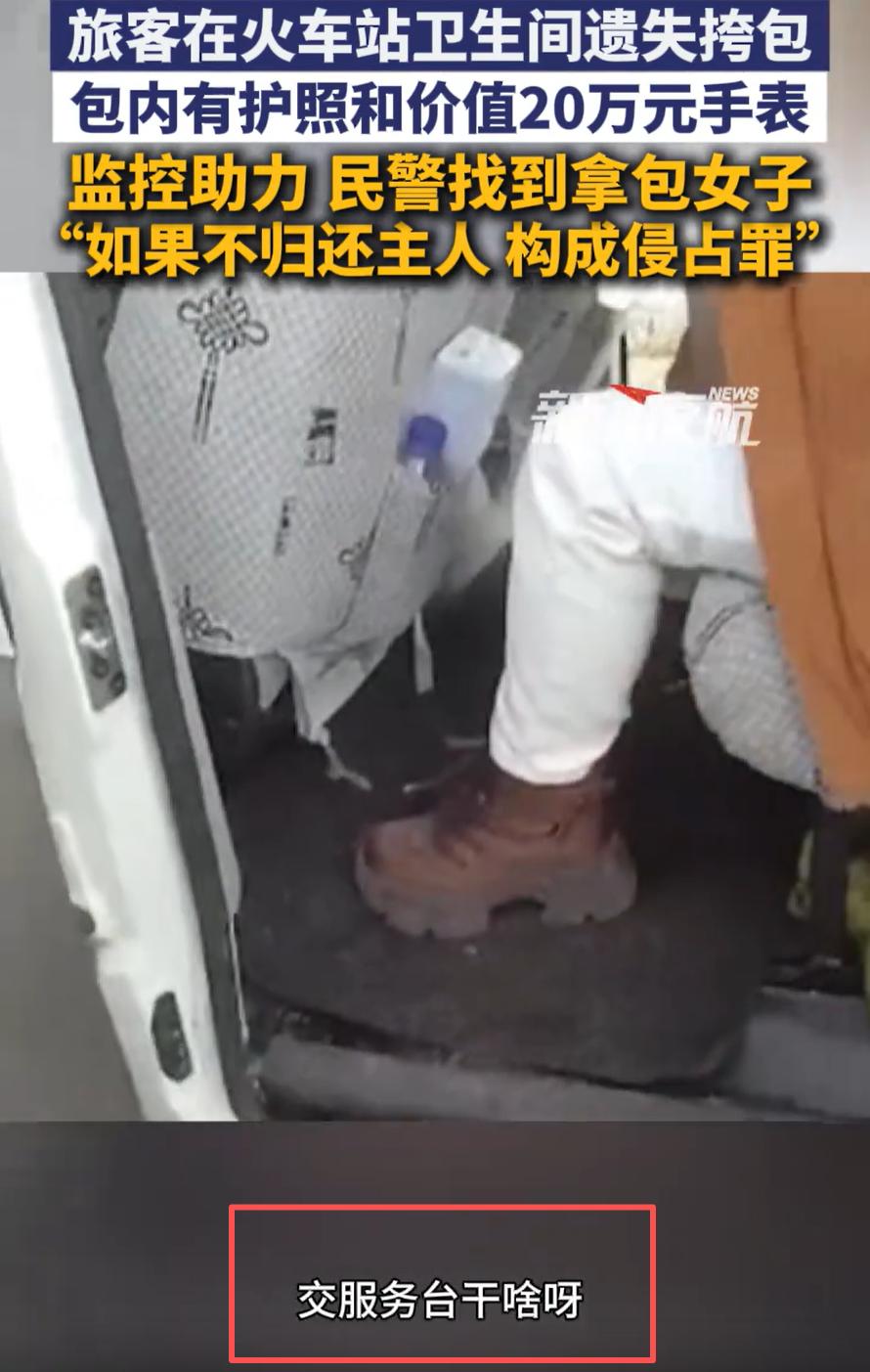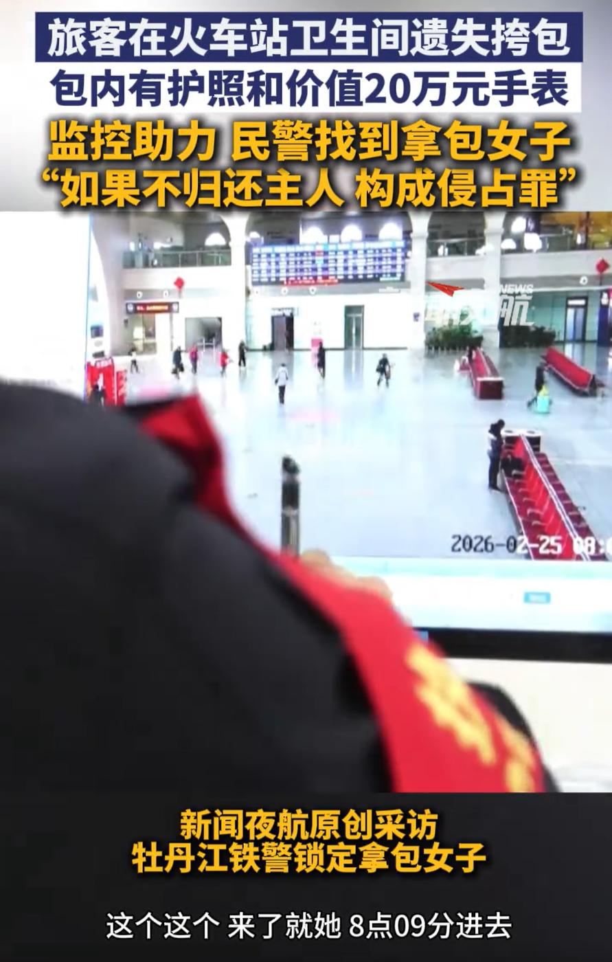 无知者无畏!黑龙江牡丹江,女子在火车站卫生间上厕所时,突然看到一个遗失的挎包,里面有护照还有价值20万的手表,当民警找到她后,询问:你怎么不交服务台?女子却反问:我交服务台干啥啊? 当天,挎包失主是准备去赶飞机的,结果在车站上卫生间时,不小心把挎包忘在了卫生间里,等她想起再返回寻找,就发现已经不见了,于是立刻找到车站民警 民警调了监控,清清楚楚地看到,在失主离开后,另一个女子进了卫生间,出来的时候,手里多了那个挎包。顺着监控一路追查,很快就找到了这个拿包的女子 找到女子后,民警一开始也挺和气,就问了一句:你捡到包,怎么没想着交到服务台或者派出所呢? 谁知道这女子的回答,直接把天聊死了。她一脸不解,反问民警:我交服务台干啥啊? 在她的认知里,东西是我捡的,又不是我偷的抢的,那就是我的了。凭什么要交出去?这种理直气壮,让民警意识到,这位大姐是真不懂法,还以为自己捡了个大便宜 民警不得不给她上了一课:你知道这包里有什么吗?有护照,还有一块20万的手表。现在失主已经报警了,监控也拍到你拿了。如果这个包你不还,这就不是道德问题了,这叫侵占罪。20万的数额有多大你自己掂量掂量,要是失主真去法院告你,到时候你的事儿就大了 这里面其实得掰扯清楚一个概念,捡和偷确实不一样,但捡了不还,和偷的结果是一样的 法律上讲,这叫不当得利,必须返还。如果别人找上门来,监控拍得清清楚楚,你还死活不给,那就从民事纠纷变成了刑事犯罪,侵占罪。这玩意儿说白了就是,你替别人暂时保管的东西,你想昧下不给了,数额大了,就犯罪。20万,这数字在哪儿都够得上数额巨大了 另外,也得提醒一句,有些人可能会说,那我还得搭时间搭路费去交公?民法典其实也考虑到了,你因为归还失物产生的必要费用,比如车费、保管费,失主是要承担的。甚至如果失主发了悬赏,你归还了,他得按承诺给赏金。但这和拒不归还的性质,天差地别 旅客在火车站遗失20万手表 民警找回