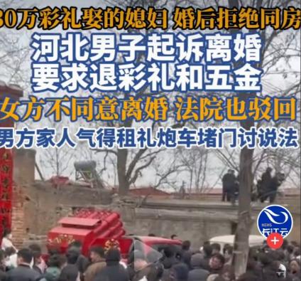 “这脸丢大了!”河北邢台,男子与女子经媒人介绍相亲,女子比他小5岁,是隔壁村的,两人彼此看好,便订了下来,彩礼加租金及物品共30多万。3个月后两人就结婚了。谁知,两人结婚2年,男子称妻子拒与其同房,不履行妻子义务。男子一怒起诉离婚,要求退还30万彩礼,哪料,妻子坚决不离婚,而法院判决让男方家崩溃,接下来他们的做法不可思议! 事情就发生在河北邢台的两个隔壁村,男方家里条件不算差,就是儿子年纪稍大,眼瞅着身边同龄人都抱上娃了,父母急得不行,托媒人四处打听合适的姑娘。没多久,媒人就带来了好消息,说隔壁村有个姑娘,比男方小5岁,人看着老实本分,双方要是能成,也算是亲上加亲。 双方约着见了面,男方觉得姑娘稳重,姑娘也觉得男方老实可靠,家里条件也能接受,没聊几次就彼此看好,当场就拍板订了亲。按照当地的习俗,男方家先后给了女方彩礼,还有租房的费用、添置首饰和衣物的钱,前前后后加起来,一共花了30多万。这笔钱,对于普通农村家庭来说,可不是个小数目,几乎是男方父母一辈子的积蓄,还有一部分是向亲戚朋友借的。 订亲之后,两人又相处了3个月,没发现什么大问题,就按部就班办了婚礼,领了结婚证,正式成为了夫妻。男方家原本以为,这就算是完成了一桩大事,以后就等着抱孙子、过安稳日子,可他们万万没想到,这只是麻烦的开始。 刚结婚的时候,两人还能凑活相处,可没过多久,男方就发现不对劲——妻子总是刻意回避他,晚上要么分房睡,要么就算睡在一个房间,也始终保持距离,坚决不让他碰。男方一开始以为,妻子是刚结婚害羞,不好意思,就耐着性子慢慢哄,可这一哄,就哄了两年。 这两年里,男方无数次和妻子沟通,劝她履行妻子的义务,好好过日子,可妻子要么沉默不语,要么就找各种借口推脱,始终不愿意和他有亲密接触,两人名义上是夫妻,实际上连普通朋友都不如。男方越想越委屈,自己花了30多万,娶回来的不是媳妇,更像是一个“陌生人”,整天住在同一个家里,却形同陌路。 家里的父母也急得团团转,看着儿子委屈,看着借的钱还没还上,再看看这个“不履行义务”的儿媳,心里又气又急。多次找女方和女方家人沟通,可女方要么避而不见,要么就说“感情没到位”,始终不给出明确的说法,也不愿意改变现状。 忍无可忍之下,男方彻底心死了,他觉得这段婚姻根本没有继续下去的必要,于是一怒之下,向当地法院提起了诉讼,要求解除和妻子的婚姻关系,并且要求女方退还当初支付的30多万彩礼和相关物品。男方觉得,自己花这么多钱,就是为了好好过日子,可妻子始终不履行妻子的义务,这段婚姻名存实亡,女方理应退还彩礼。 本以为这场官司稳赢,可开庭的时候,女方的态度却让男方一家始料未及。女方坚决不同意离婚,还当庭反驳了男方的说法,说自己并没有拒绝和男方同房,两人一直是正常同居,感情也很好,之所以男方会有这样的说法,是因为男方曾经对她实施过打骂、拖拽,让她产生了心理阴影,甚至患上了抑郁症,还去医院住过院。 女方还说,当初收到的30多万彩礼,并没有存起来,而是大部分都用来购买陪嫁物品、电动车,还有两人婚后的生活开支,再加上自己看病的医药费,早就花完了,根本不存在“退还彩礼”的说法。女方的律师也表示,男方的说法只是一面之词,没有足够的证据证明双方感情破裂,也没有证据证明女方拒绝履行夫妻义务。 法院经过开庭审理、核实相关证据后,最终做出了一审判决——驳回男方的全部诉讼请求,不准予双方离婚。这个判决一出来,男方一家彻底崩溃了,他们怎么也想不通,自己花了30多万,结婚两年连夫妻之实都没有,明明是女方不履行义务,为什么法院会驳回自己的请求? 崩溃之后,男方一家做出了一个不可思议的举动——他们租了一辆礼炮车,直接开到了女方娘家的村口,用礼炮吸引村民围观,还拿着喇叭反复喊“骗婚”“还彩礼钱”,甚至开启了直播,把这件事公之于众,想通过这种方式给女方施压,让女方同意离婚、退还彩礼。 他们这样的做法,连续持续了四天,每天都有人围在女方家门前围观,不仅影响了女方一家的正常生活,还让女方和她的家人遭到了网络暴力,连亲戚都受到了波及。女方家人无奈之下,只能把法院的一审判决书贴在门口,向村民澄清事实,还向当地政府求助,希望能通过合法途径解决这件事。 其实很多人都不知道,法院这样判决,并不是没有道理。根据2024年2月1日起施行的《最高人民法院关于审理涉彩礼纠纷案件适用法律若干问题的规定》,双方已经办理结婚登记且共同生活,离婚时一方请求返还彩礼的,法院一般不予支持。 有人说,男方太冤,花了30多万却落得这般下场;也有人说,女方不该拖着不离婚,不想过就好聚好散;还有人说,法院的判决没问题,法律讲的是证据,不是单方陈述。 那么问题来了,你觉得这场纠纷里,谁更委屈?男方用这种极端方式维权,到底对不对?如果是你,遇到这样的情况,会怎么做?