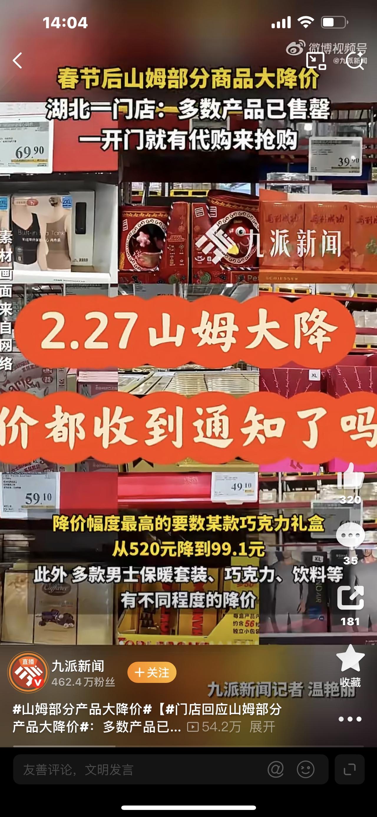 疯抢!山姆突然大降价,520元变99元,开门1小时被扫空,普通人根本抢不到 紧急提醒!山姆突然搞事情,部分产品大降价,力度大到离谱,全国门店都炸锅了! 你没看错,原价520元的高端巧克力礼盒,直接降到99.1元;249元的品牌卫衣,69.9元拿下;179元的保暖套装、家居服,通通69.9元;羊绒背心129元砍到69.9元,这波简直是清仓甩卖! 消息一爆出,全网沸腾。多地山姆门店刚开门,代购、宝妈、囤货党直接冲进去,热门款不到一小时全被抢空,货架一扫而空,晚到的只能看着空架子叹气。 很多人疑惑,一向高端定位的山姆,怎么突然“放低身段”? 转折点来了:这不是短期活动,而是年后清库存+抢客源的双重操作,一边处理换季服饰、节日礼盒,一边用超低价留住会员,实打实给福利,不是套路! 有人说这是商家营销,有人说错过再等一年。但实话实说,品质不变、价格腰斩,不管是自己穿、家里用,还是送人情,这时候入手最划算。 平时舍不得买的,现在闭眼入;平时经常买的,现在多囤几箱都不心疼。这不是冲动消费,是真正会过日子。 生活嘛,不就是抓住这些实在的优惠,把日子过得更舒服。 这波山姆降价,你抢到了吗?评论区聊聊你薅到了什么羊毛! 山姆专卖店 山姆会员规则 山姆购物攻略 山姆热销榜 山姆价格表