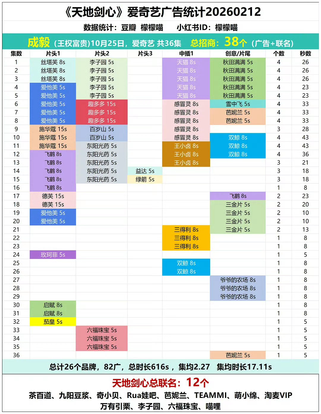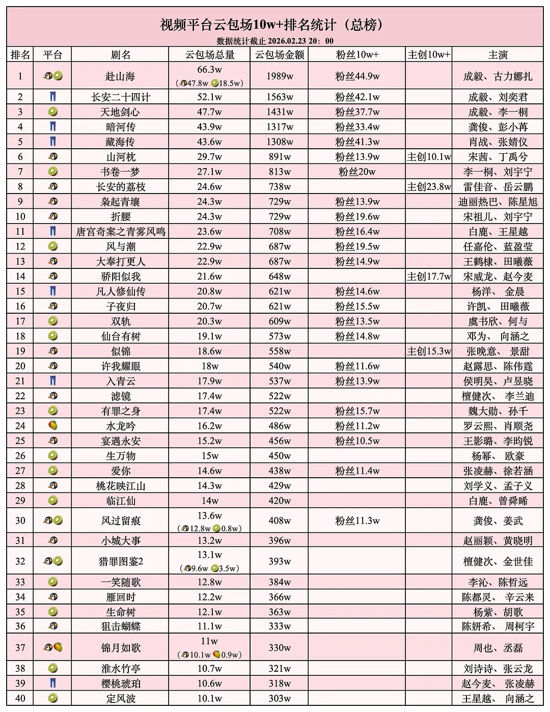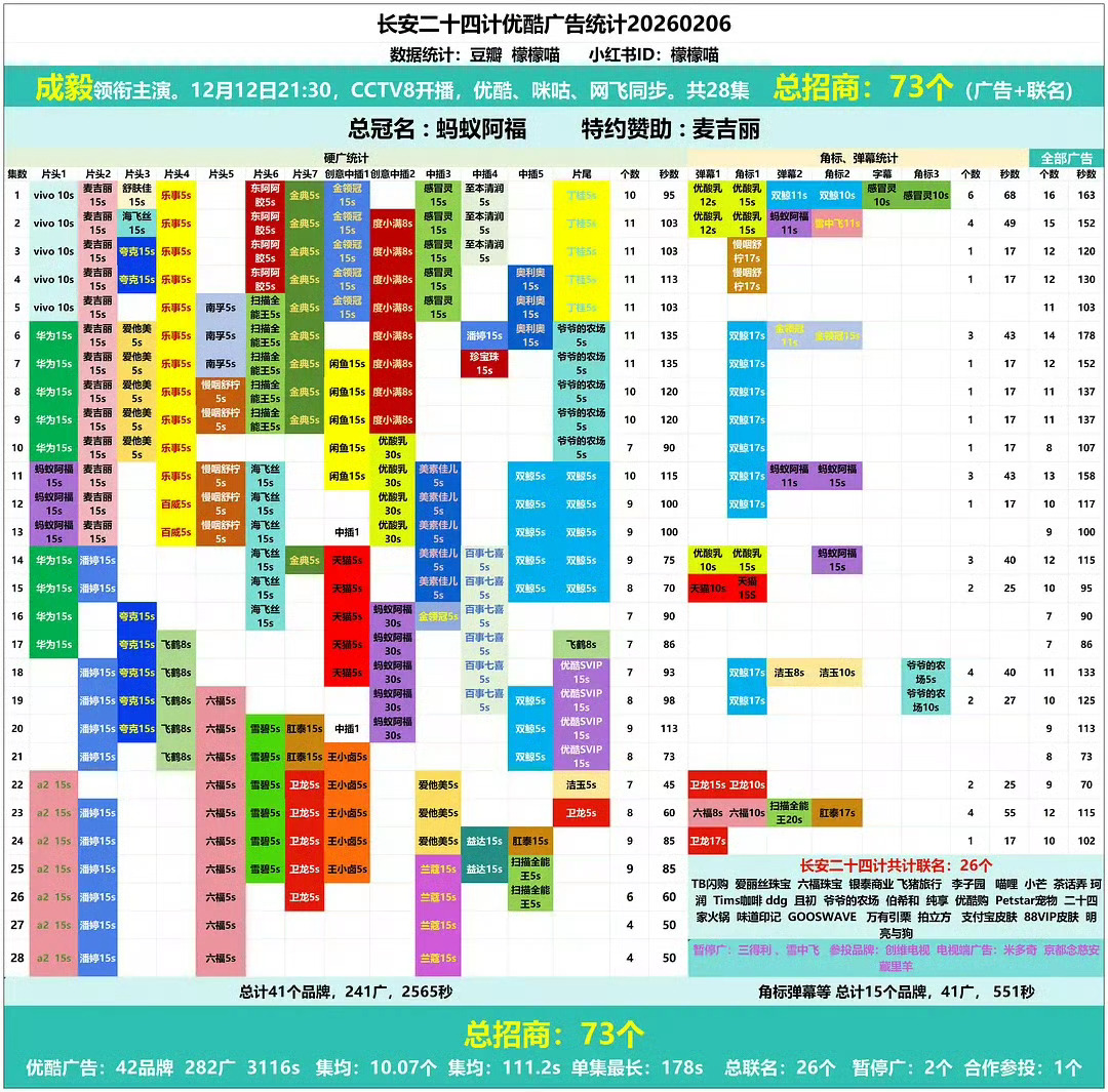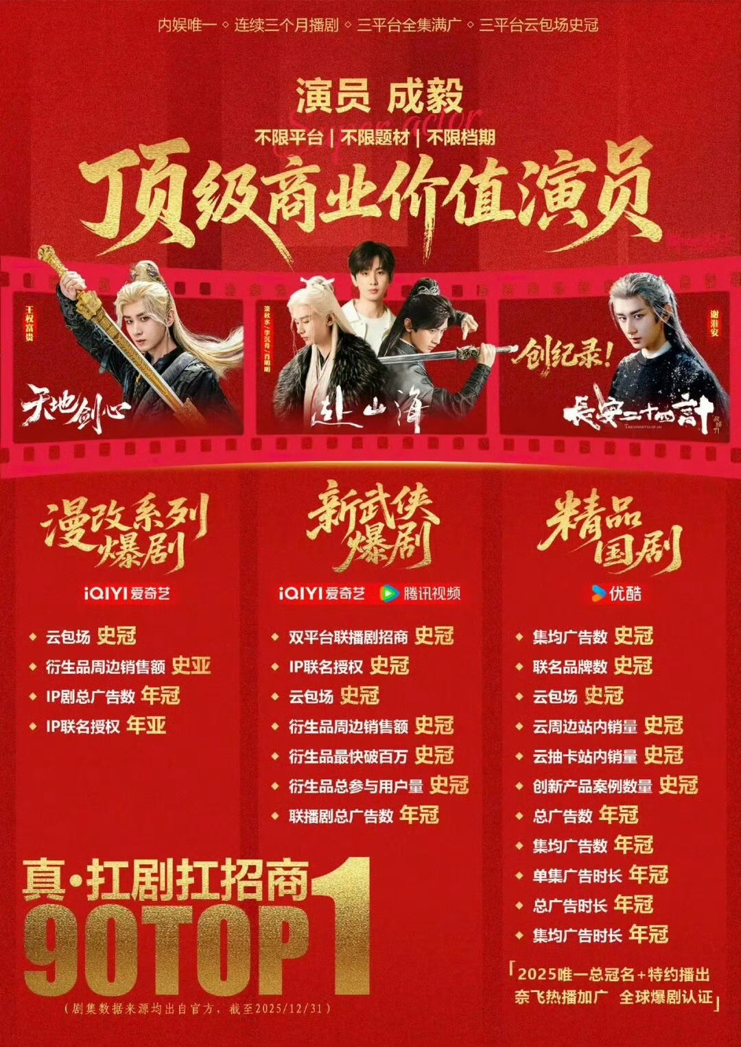 内娱最新云包场表格,成毅三部剧依然保持内娱断层前三,赴山海66.3万座云包场,长安二十四计52.1万座,天地剑心48万座,保持各平台云包场历史第一纪录。25年连播三部剧的招商,赴山海123个、天地剑心38个、长安二十四计73个,而且还是在年末品牌预算紧张的时候。赴山海周边破亿,创全平台史冠。长安二十四计虽仅28集,但联名周边销量达约7452万,云包场云抽卡站内周边销量等均创优酷历史纪录。天地剑心在爱奇艺创下IP热播期授权消费品销售额新高,周边销量超750万,由于片方有私心,本应更高,在ee三部剧中周边是最少的,但还是依然碾压内娱。在各大资本和市场眼中,大一番的核心价值就是扛剧、招商、播放量、话题度等等,市场早已证明,成毅就是内娱断层的存在。观众就是对成毅的剧尤其戏份越多的剧最感兴趣,成毅尊重观众,尊重每个角色,早已成为剧集品质与商业回报的金字招牌。影视寒冬,成毅这样又有实绩演技又好又能带动剧集商业价值的超大流量,是极其稀有且珍贵的真扛剧演员,ie还是吹少了,所以有的人想着登月碰瓷啊。