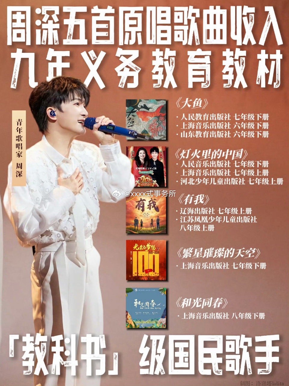 周深又有一首原唱歌曲被收录到教材了,截至目前周深已经有五首原唱作品入九年义务教材了,这是真实力流量兼具的国民歌手,又红又专样样都强