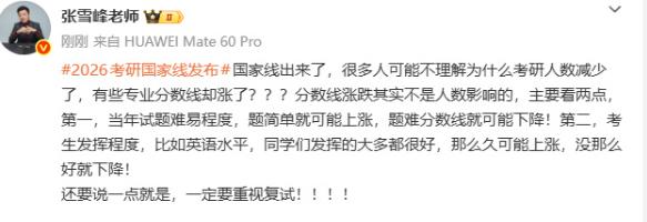 张雪峰谈考研人数减少分数线却涨了,一句话点透关键,考生看完秒懂 考研党注意了!张雪峰谈考研人数减少分数线却涨了 冲上热搜,张雪峰老师发文解读,解开了很多考生的疑惑。 他直言,国家线一出来,不少人都懵了——明明今年考研人数减少了,可有些专业的分数线反而涨了,实在想不通。 张雪峰直接点破关键:分数线的涨跌,其实和考研总人数没有直接关系,核心只看两点,看完大家就明白了。 第一点就是当年试题的难易程度,如果题目出得比较简单,大部分考生都能考出高分,分数线自然就会跟着上涨。 反之,如果当年的试题难度偏高,考生整体得分都偏低,那么分数线也会相应下降,这是最直观的影响因素。 第二点就是考生的整体发挥程度,比如大家最关心的英语科目,如果多数同学发挥得都不错,整体分数偏高。 那么对应专业的分数线,也会随之上涨;要是考生整体发挥不佳,分数普遍偏低,分数线也会跟着往下调。 很多考生之前都有个误区,觉得考研人数少了,竞争就小了,分数线肯定会降,其实这是完全错误的认知。 有考生留言吐槽,自己今年备考拼尽全力,本以为人数减少能轻松点,结果分数线涨了,直接陷入焦虑。 也有考生表示,听了张雪峰的解读瞬间豁然开朗,原来分数线涨跌和题目难度、自身发挥挂钩,和总人数无关。 其实仔细想想也合理,考研看的是相对竞争力,不是绝对人数,哪怕人数减少,只要大家考得好,分数线就会涨。 比如有些热门专业,虽然报考人数比去年少,但考生整体水平都很高,得分普遍偏高,分数线自然会往上走。 张雪峰的解读,也给后续备考的同学提了个醒:不用过分关注报考人数,重点放在提升自身实力、适应试题难度上。 毕竟不管人数多还是少,只有自己考出高分,才能更有把握上岸,纠结人数和分数线的波动,反而会影响心态。 还有很多网友调侃,张雪峰果然是考研界的“清醒剂”,一句话就点透核心,帮大家避开了认知误区。 对于已经查完成绩、准备复试的同学来说,与其纠结分数线涨跌,不如专心准备复试,争取顺利上岸。 而对于正在备考的同学,也可以参考这个逻辑,合理规划复习,重点攻克薄弱环节,才能在考场上发挥更好。