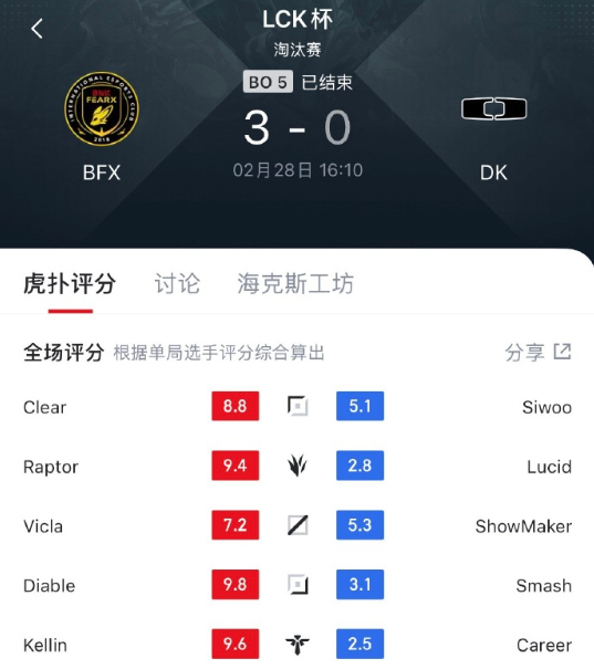 赛前以为DK能3比2拿下BFX没想到直接被零封,想不明白T1到底是怎么输给T1的。。。接下来LPL将在先锋赛面对BFX和GENGBFX晋级全球先锋赛BFX零封DK英雄联盟