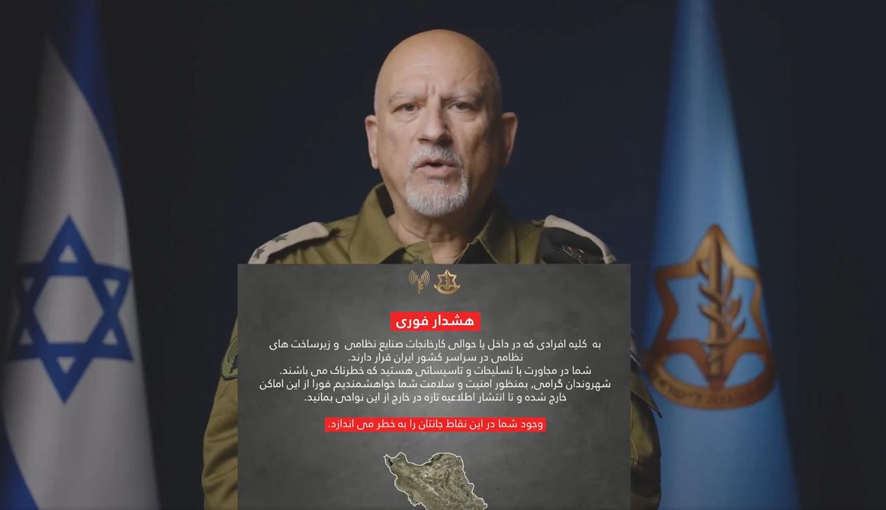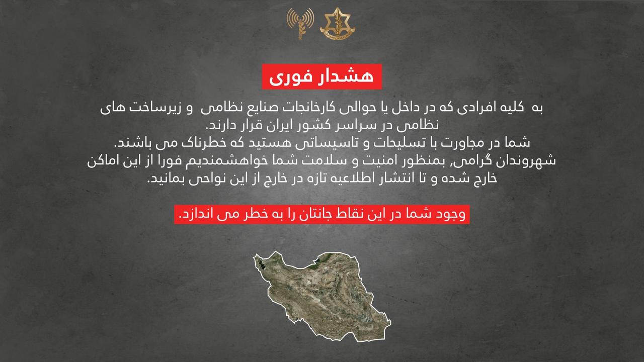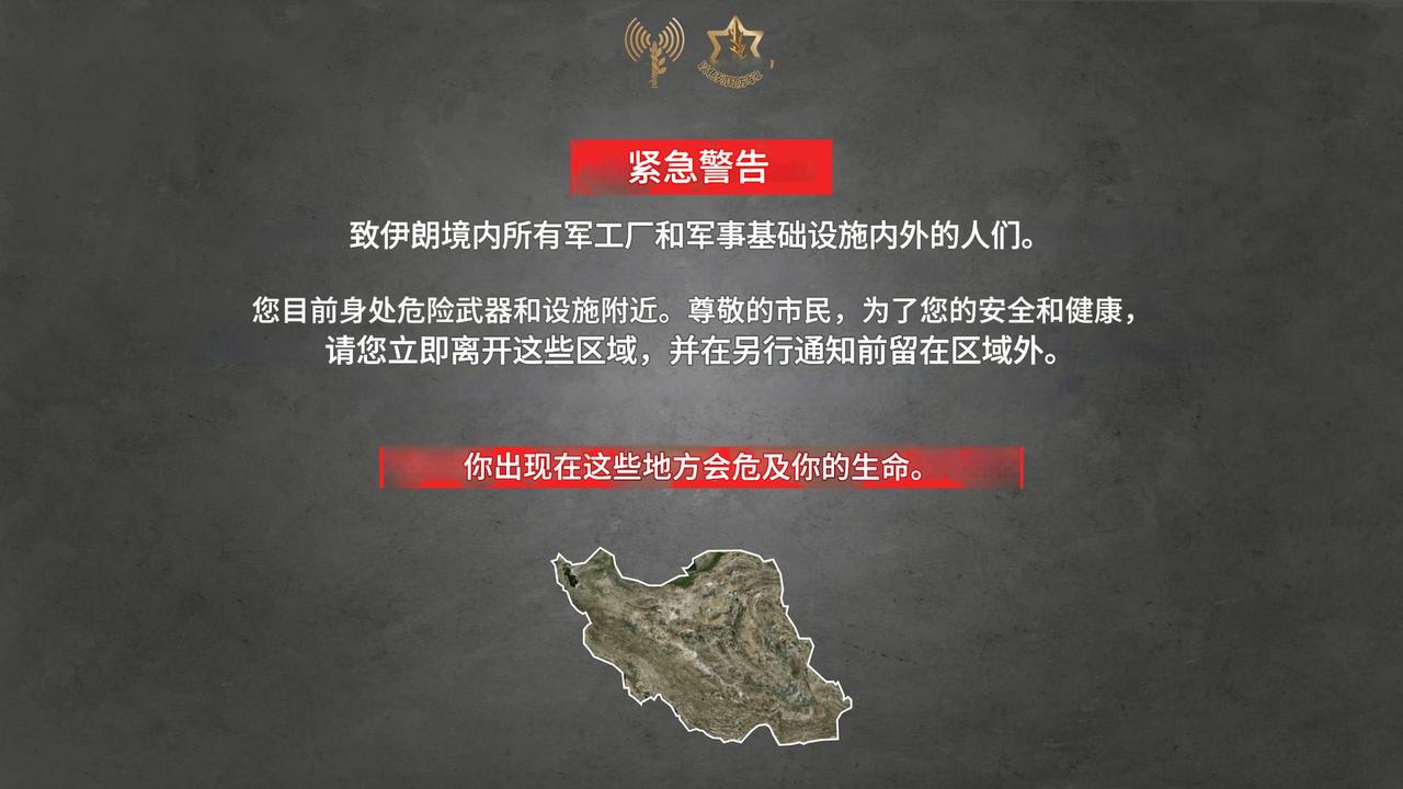 紧急警告:伊朗境内所有军工企业及军事基础设施内或附近的人员请注意,您正处于危险武器和设施附近。为了您的安全和健康,我们恳请您立即撤离这些区域,并在发布新的通知前留在室外。您身处这些区域将危及您的生命安全。