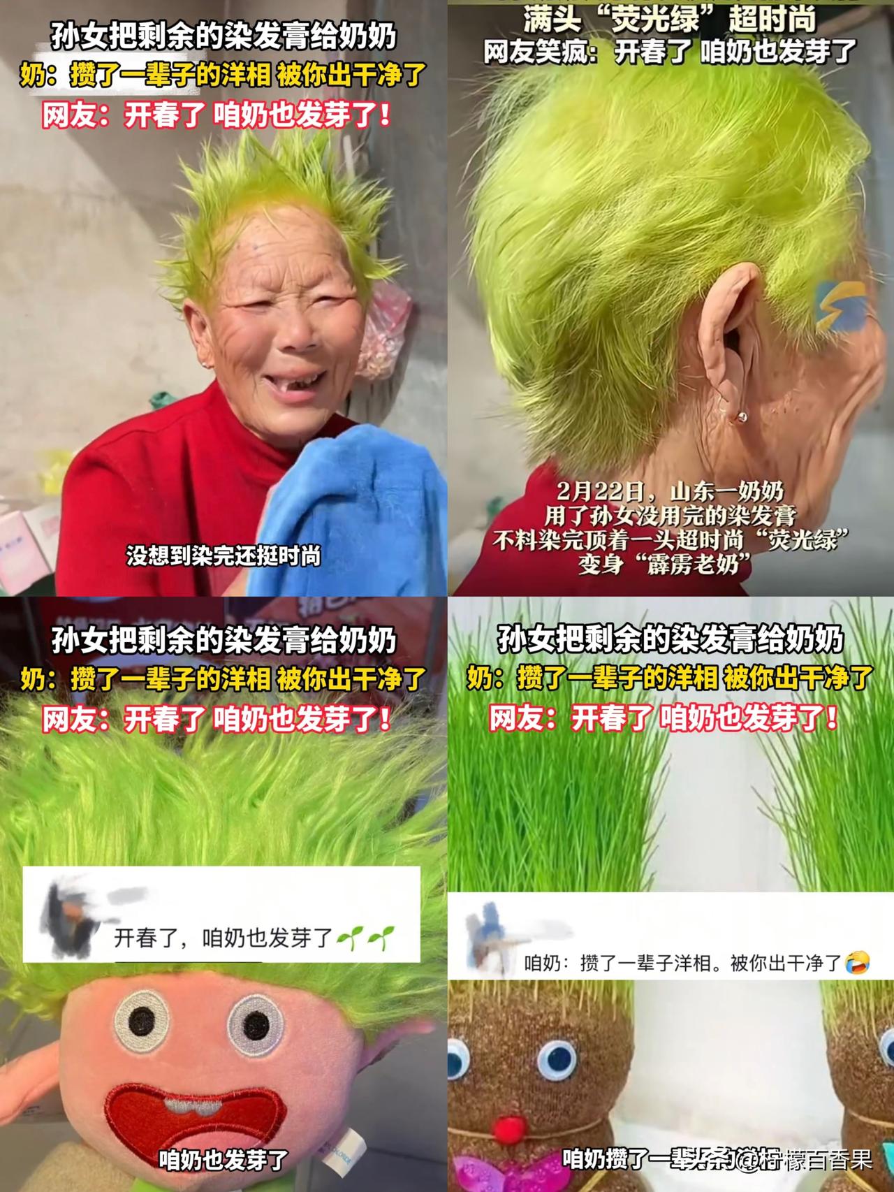 山东一位奶奶最近凭一头“开春限定发色”火出了圈😂。孙女把用剩的染发膏给了奶奶,本着“不浪费”的传统美德,奶奶直接往头上抹,结果一头银发秒变炸毛荧光绿,活像刚从地里冒出来的“春芽”。 看着镜子里的自己,奶奶又好气又好笑:“攒了一辈子的洋相,被你出干净了!”网友们更是笑到打鸣,纷纷玩梗:“开春了,咱奶也发芽了”“这发色,晚上出门自带照明,广场舞C位直接预定!” 还有人把奶奶的发型P成了同款玩偶和草头娃娃,相似度直接拉满。虽然奶奶嘴上“吐槽”,但这抹亮眼的绿色,也成了祖孙俩最欢乐的回忆。 温馨提醒:老年人头皮敏感,使用年轻人的染发剂前,最好先做皮肤测试,别为了省点膏膏,把自己“折腾”了哦~