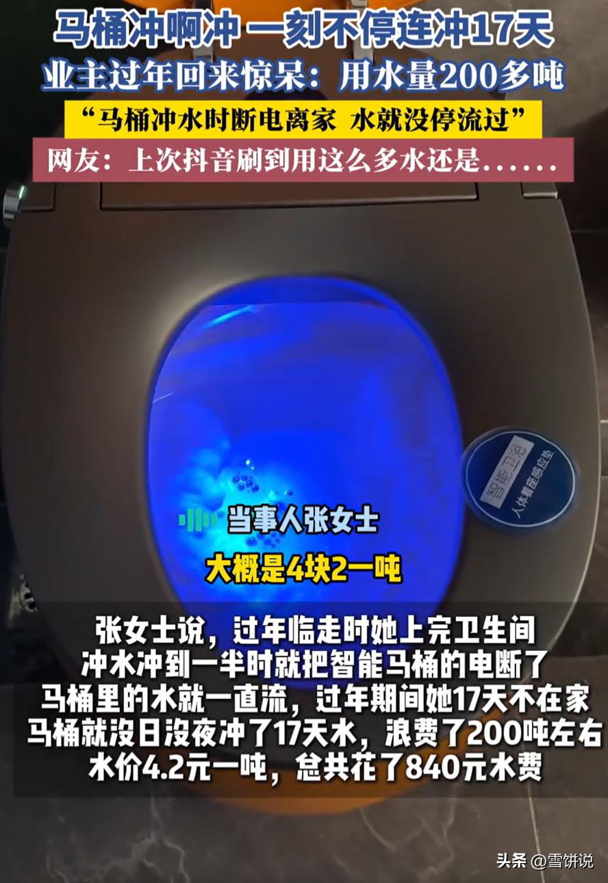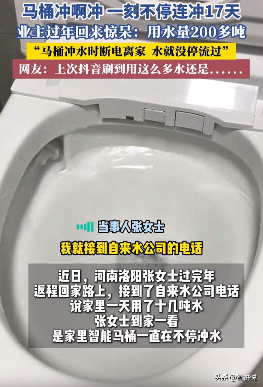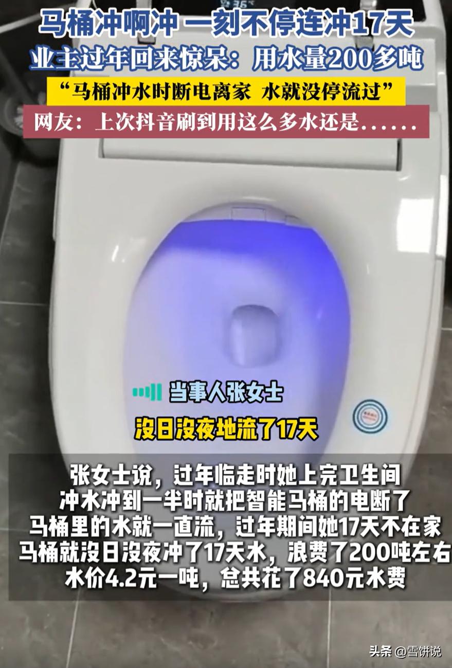 这次水费有点贵了!河南洛阳,女子过年回老家,准备返程时突然接到自来水公司打来的电话,对方提醒她家里耗水异常,女子还以为是骗子电话,家都没人怎么可能耗水,结果回家一看17天耗水超200吨,而问题就出在了智能马桶上面 原来,张女士在当时出发回来家前用了马桶,结果冲水到一半时把电源拔了。这一拔不要紧,马桶的阀门没复位,水就这么一直流着 大半个月里,马桶一天不停地漏水,17天时间,家里凭空用掉了200多吨水,按4.2元一吨算,这笔水费要840块钱 说实话,这事听着挺冤的。谁能想到拔个电源还能把马桶整漏水?但仔细想想,现在家里头的智能设备越来越多,功能越来越复杂,出问题的可能性也跟着上来了 智能马桶听着高大上,电动冲洗、座圈加热、自动感应,功能一堆。可一旦停电或者断电,有些型号的阀门复位机制确实存在隐患。不是阀门关不上,就是复位不及时。张女士碰上的,就是这种情况 这事的教训其实挺实在的。家里的智能电器,不管是马桶还是别的什么,出门前最好都检查一遍。特别是带水带电的设备,光拔电源还不够,得确认阀门确实关死了