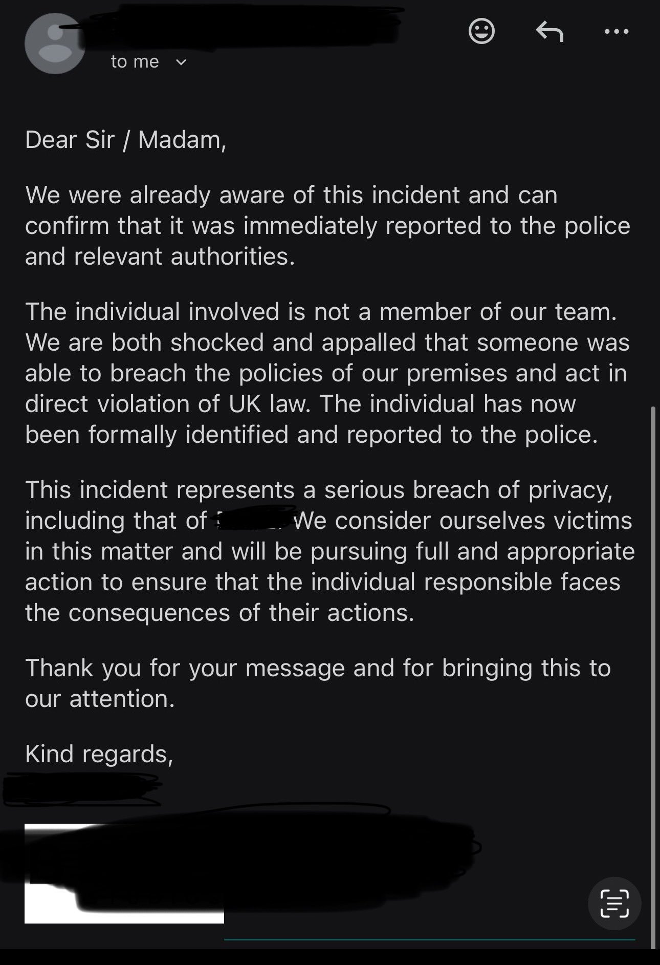 这一事件是对隐私的严重侵犯,其中也包括[被遮挡姓名]的隐私。我们认为自己也是此事的受害者,并将采取一切适当的法律行动,以确保责任人承担其行为的后果。