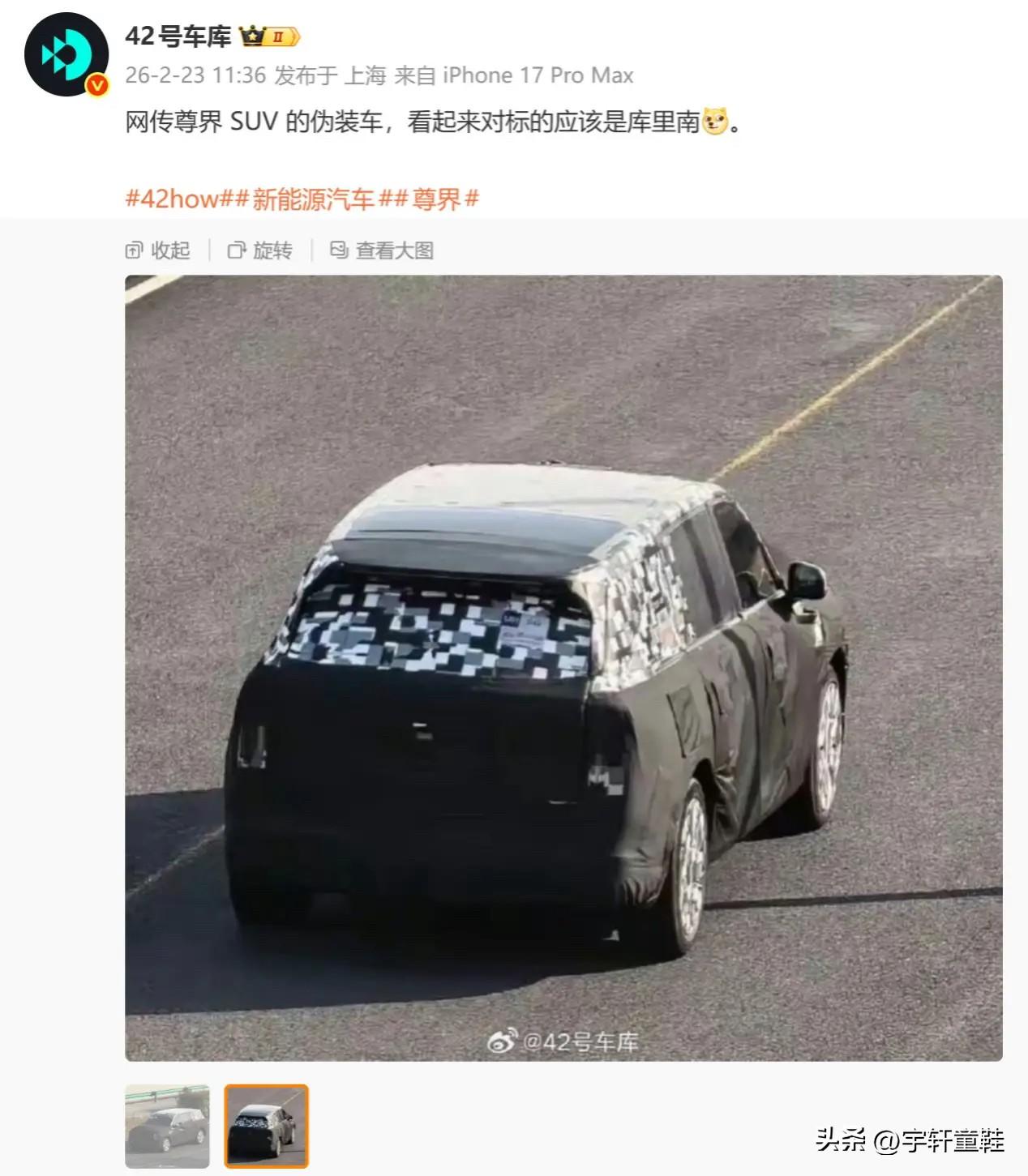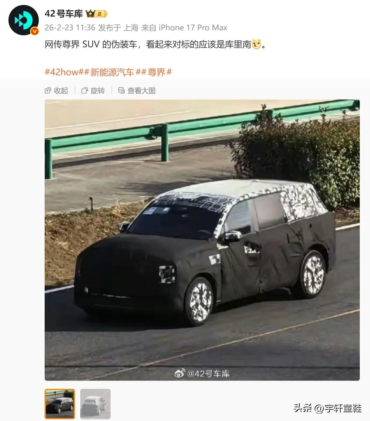 仰望U8瑟瑟发抖! 尊界首款SUV伪装车曝光! 比亚迪再不努力跟营销,等尊界SUV出来,仰望估计也难了! 不管尊界SUV是不是对标库里南,上市后直接竞争的肯定是仰望U8系列! 并不是仰望技术不行,也不是鸿蒙智行技术太好,而是鸿蒙智行营销做得太好,跟比亚迪系的营销不是一个档次,所以就影响力这块,强的不是一点点!大家觉得呢?