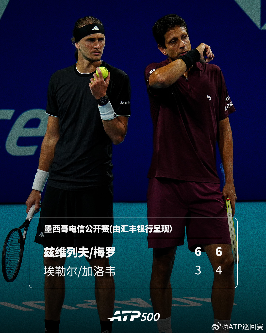 ATP500 墨西哥电信公开赛(由汇丰银行呈现)双打决赛,兹维列夫/梅罗以6-3 6-4击败埃勒尔/加洛韦,首次联手夺得巡回赛双打冠军。这是兹维列夫男双第3冠,对梅罗来说则是42冠。