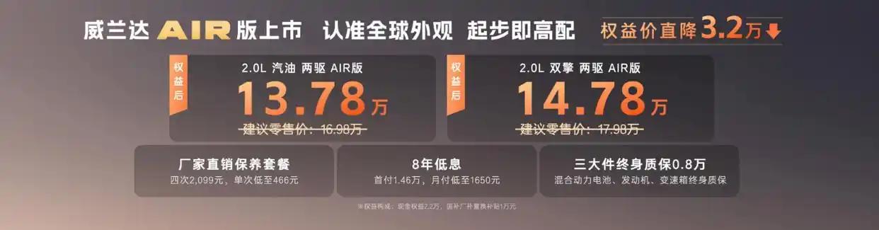 在这样的行业大背景下,广汽丰田推出威兰达AIR版,其核心逻辑并非简单的“以价换量”,而是“以价值换市场”。 13.78万元的起售价,不仅击穿了以往合资紧凑型SUV的价格底线,更是直逼许多自主品牌同级车型的腹地。 但与单纯降价不同,威兰达AIR版打出的是“起步即高配”的王牌,试图在价格下探的同时,将产品价值拉升至新的高度。