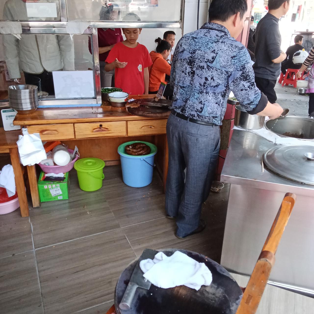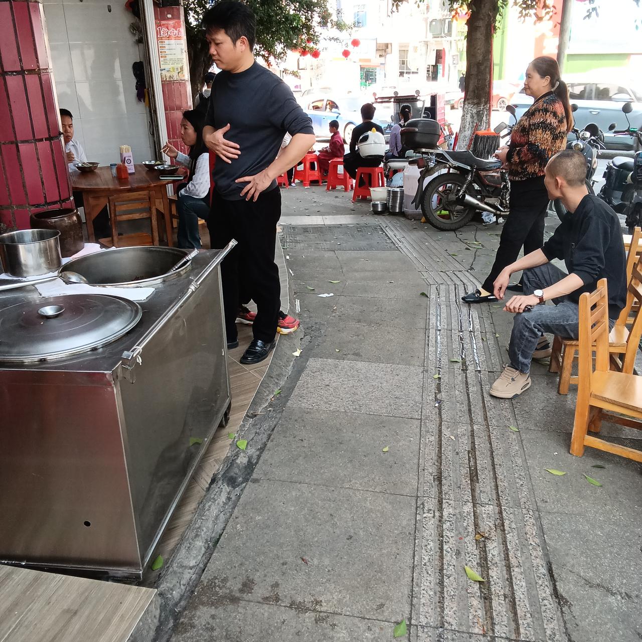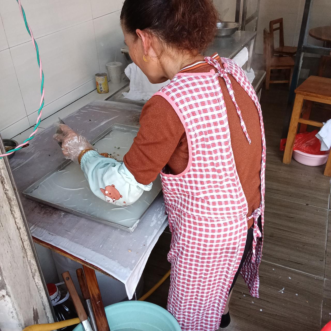 巴马县长寿大道上的粉店 今天来到巴马县城,终于在一家分店用餐,这家店没有门面,只在路边开放式的摆了个摊位。 当时已经有十七八个人在等餐我就排在了后面关键是这十七八位有的一人竟然买6~8份。 粉有两种,一种是汤粉,一种是卷粉。 卷粉的做法是用大米浆摊成薄饼,卷上肉肠花生碎小葱花的。 烫手的做法比较普遍,不用细说。 两种粉,一份都是8元。 老板两夫妻低头忙碌,女士做米饼,男士制做包料。根本不想喘上一口气。 我拍了大约半小时才吃上热乎乎的卷粉(见图片五)。 味道真心不错,咬一口香香的。配料有酸黄瓜、小香葱、西红柿汁。 一家店能种成这样也是无敌了。