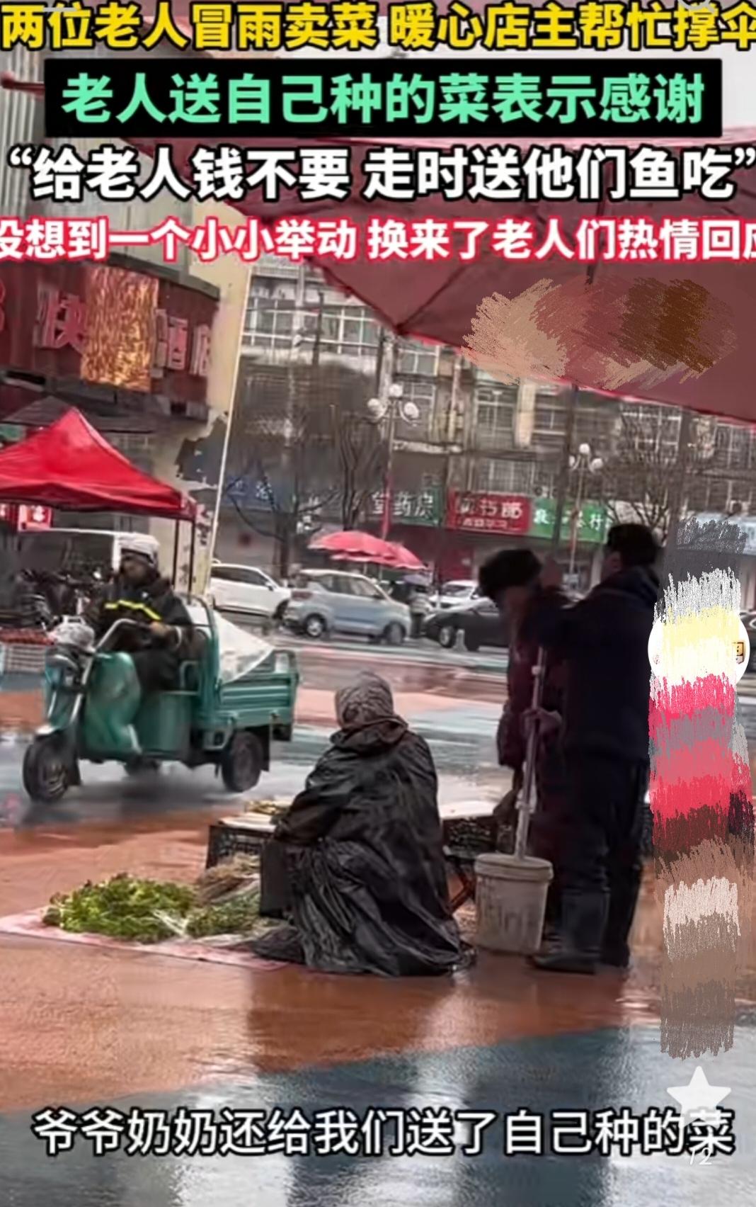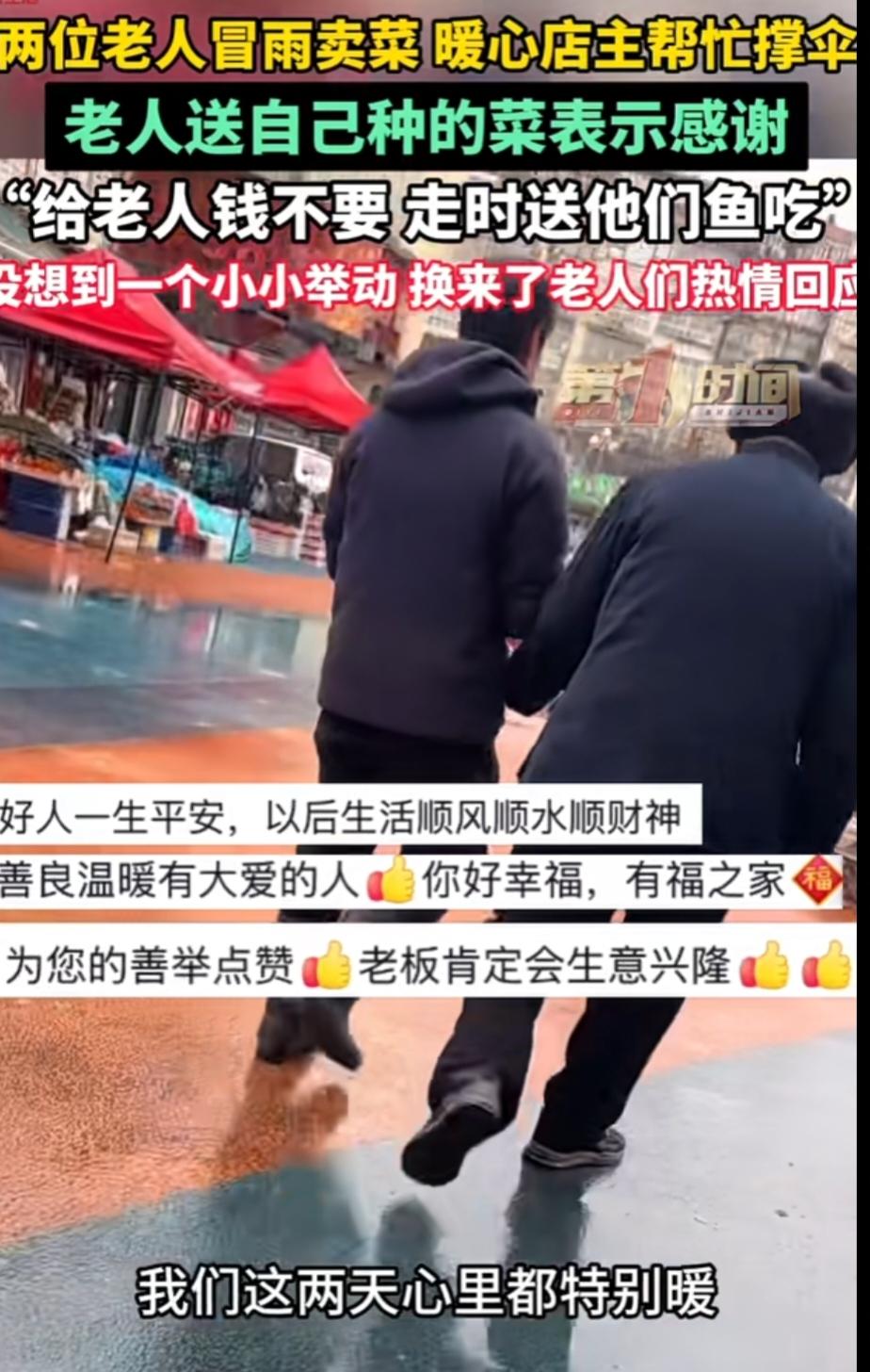 3月1日,江苏连云港,一大早天色渐渐阴暗,一场大雨似乎在蓄势待发,整个大街小巷没几个行人。但即便如此,这对大爷大妈一如既往,老早在一家饭店门口前摆摊卖菜。 果不其然,大爷大妈刚支摊没多久,天空中雨滴稀里哗啦,打湿了所有的屋顶、街道、行人以及没来得及收好的蔬菜。 大爷大妈是过来人,对天气的变化很有经验,一看到这样的天气,接下来无疑是阴雨绵绵。老两口为了尽快处理掉这些蔬菜,他们只好穿上了随身携带的雨衣。 可即便如此,无情的雨滴依旧乘虚而入,打湿了大爷大妈的头发、脸庞、脖子以及衣角等。此时再看他们,脸色发青,嘴唇颤抖,双手紧握,眉头紧皱,两双发光的眼睛始终盯着过往路人。 可路人行色匆匆,没有一人光顾! 就在此时,一旁开饭店的老板终于回来了,他之所以冒雨外出是因为要给顾客送单。 刚到店门口,老板一转眼便看到了这对大爷大妈,觉得两位老人很不容易,心想要不是身上有千斤担,谁会冒这么大的雨卖菜呢? 很快,老板拿出了店里的遮阳伞,给大爷大妈撑好。大爷大妈发现了老板的善举,微笑着表示感谢。老板同样微笑而道:“一点小事,无足挂齿!” 几分钟后,店里的老板跟老板娘正在说着什么,老板娘一抬头便看到大妈朝店门口走过来,大妈手里提着一些菜,来到了店门口便轻轻敲了敲门。 老板娘见状,立刻前去开门。大妈:“很感谢你们,你们都是好人,这些菜你们拿着,这是自己种的菜。” 老板娘:“谢谢大妈,不用了,您卖菜很不容易!” 见老板娘不收,大妈直接上手了,说啥也要让老板娘收下,拧不过大妈的老板娘表示自己愿意留下但前提是大妈肯收钱。没想到大妈挺倔的,既要把菜送出去还不要老板娘的一分钱。 看到大妈如此诚心诚意,老板娘也只能收下了这份素不相识的心意。 等大妈离开,老板娘对着老板说:“咱们拿一条鱼给大爷大妈吧?”老板微笑着点点头,没想到两人一拍即合,随后老板抓鱼时还抓了一大条。 来到大爷大妈跟前,老板一边塞鱼一边说:“这个你们拿去吃!”看到老板把这么贵的鱼送给自己,大爷大妈顿时推搡,说啥也不能要,但老板也挺倔,非要送出去才行。 最后,大妈接过了鱼,笑了起来,连忙说着“谢谢!” 事后,老板娘回忆时说:“这几天心里一直暖暖的,没想到一个小小的举动,换来了老人热情回应!” 有时候,来自陌生人之间的关心和照顾更戳人心,一对老夫妻和一对小夫妻之间的互动,可谓是心有灵犀一点通。 人与人相处,就应该如此,我们尽管善良,我们尽管付出,未来有一天,你的善良和付出终将“开花结果”,让你甜到嘴里,美在心里。 (素材来源于网络,若有侵权请联系删除!)