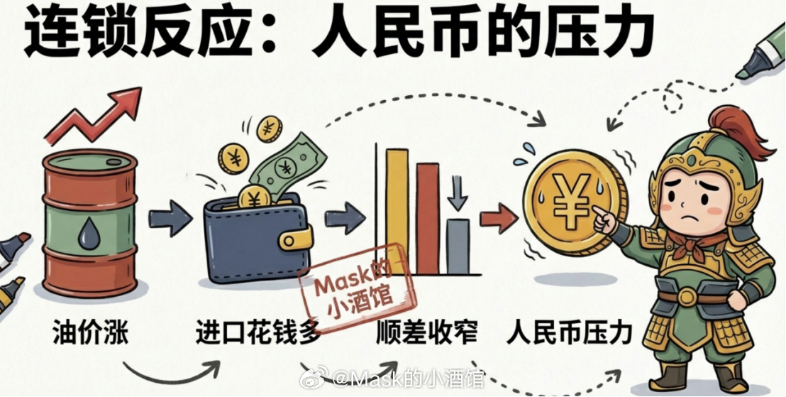 一旦伊朗的出口受到冲击,东方就得去全球市场抢购替代货源,抢购就意味着出价更高,油价就会继续被推高。油价涨了,东方的进口支出就增加,贸易顺差就会收窄,叠加全球风险情绪下美元走强,人民币就会面临贬值压力。所以说,这是一个连锁反应,东方不能完全置身事外。