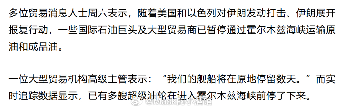 中东打起来之后,已经有多家大型石油贸易商和能源公司宣布暂停霍尔木兹海峡的原油运输,理由是风险太高。