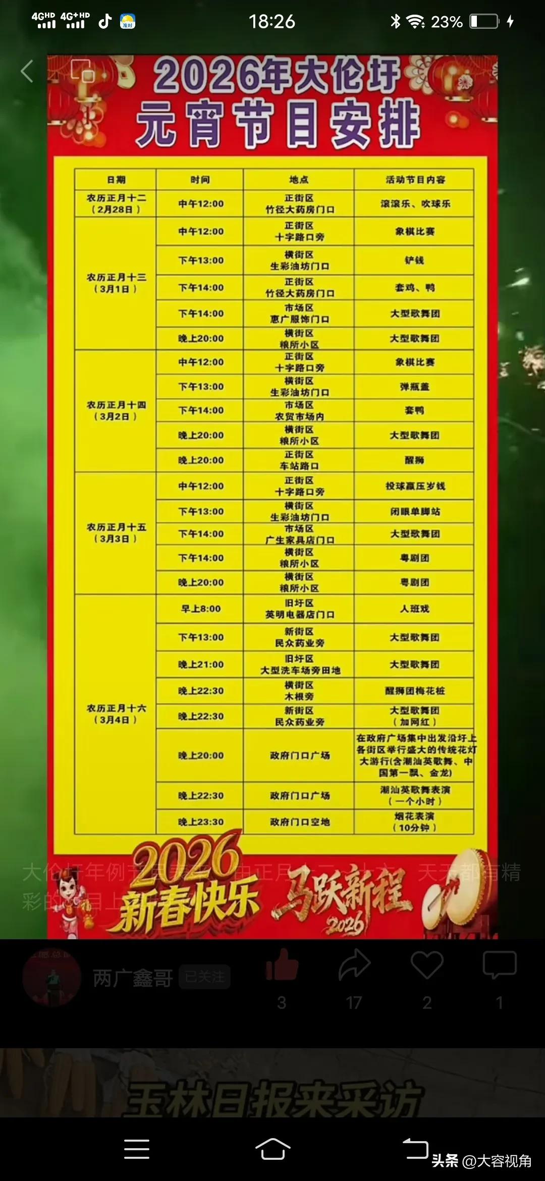 大伦元宵节:热闹非凡的民俗盛会 2026年大伦元宵节的节目安排丰富多彩,从正月十二到正月十六,每天都有精彩活动,让整个大伦镇沉浸在喜庆的节日氛围中。根据图片内容,元宵节的活动安排得井井有条,从白天到夜晚,各种民俗表演轮番上阵,令人目不暇接。 正月十二的活动在竹巷大药房间拉开了序幕,深潭乐、吹乐球等传统表演为元宵节预热。随后的几天,活动地点主要集中在正街区、市场口、横街区等,象棋比赛、拔河比赛、篮球赛等项目吸引了众多村民参与。尤其是象棋比赛,从上午持续到晚上,棋手们在棋盘上一决高下,展现了智慧与策略的较量。 正月十四的活动更是精彩纷呈,上午的象棋比赛结束后,晚上7点,政府门口广场举行了盛大的烟花表演,璀璨的烟花照亮了整个夜空,为元宵节增添了浓厚的节日气氛。而正月十五的活动达到了高潮,上午的象棋比赛和拔河比赛结束后,晚上7点,横街区举行了大型歌舞剧表演,演员们用优美的舞姿和动听的歌声表达了对新年的祝福。紧接着的猜灯谜活动更是吸引了众多村民参与,大家在欢声笑语中感受到了传统文化的魅力。 正月十六是元宵节的尾声,但活动依然精彩。上午的民工吹乐器比赛展示了劳动人民的才艺,而晚上的大型歌舞剧和鞭炮梅花枪表演则为元宵节画上了圆满的句号。在政府广场集中放沿江上春园区举行盛大的传统花灯游行,花灯造型各异,栩栩如生,吸引了众多村民驻足观赏。大游行(含潮汕英歌舞、中国第一鼓、金龙)更是将节日的气氛推向了顶点,潮汕英歌舞的激情四溢,金龙的威武霸气,让村民们感受到了传统文化的博大精深。 大伦镇的元宵节,不仅是一场视觉与听觉的盛宴,更是一次传统文化的传承与弘扬。通过这些丰富多彩的活动,村民们在欢庆佳节的同时,也增进了彼此之间的感情,展现了大伦村团结和谐的精神风貌。