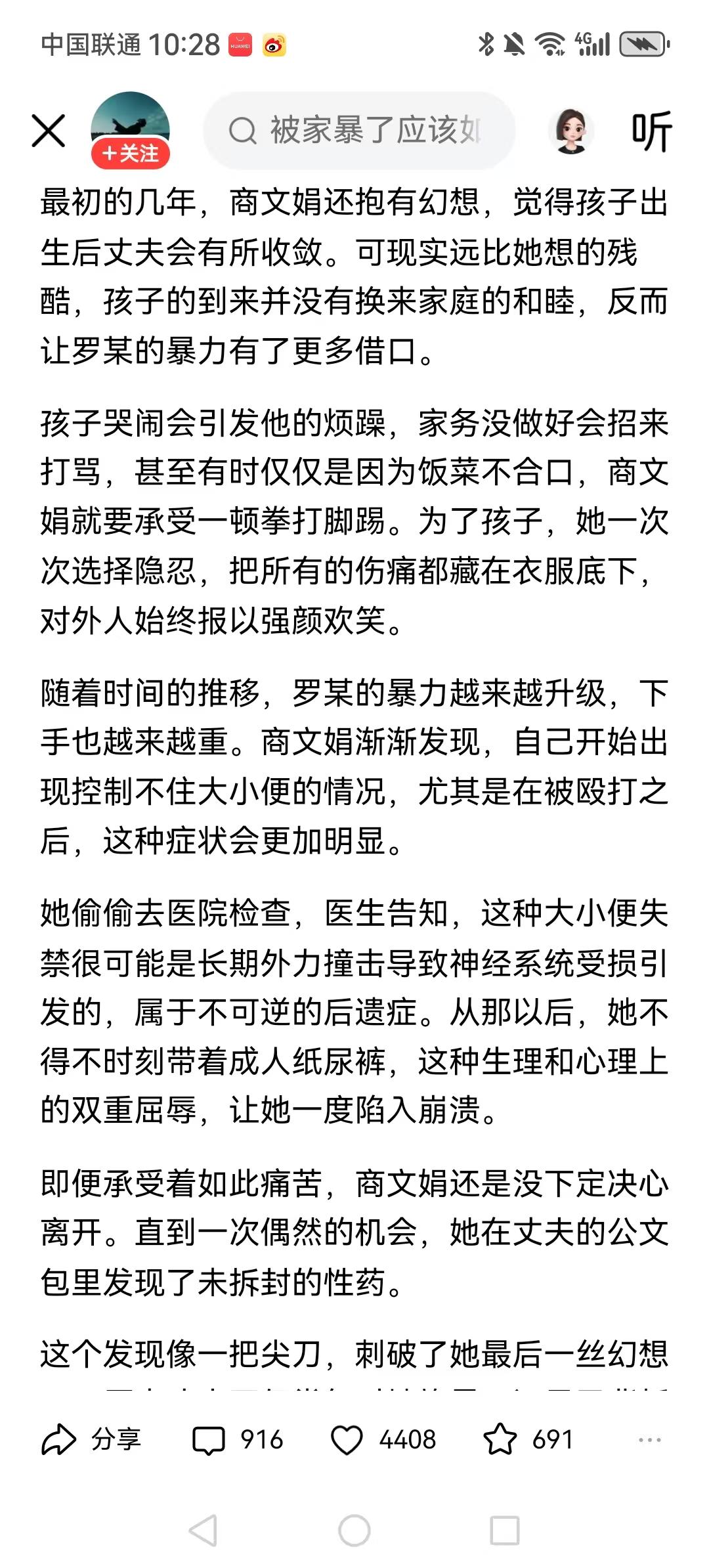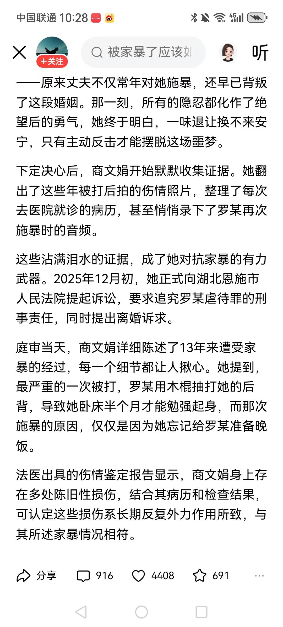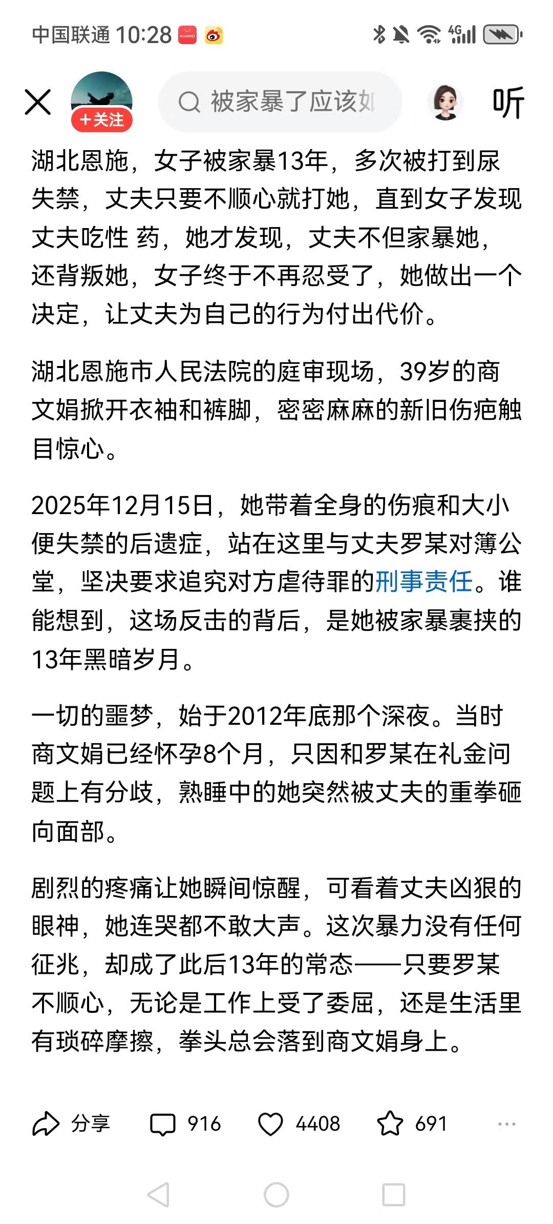 湖北恩施,女子被家暴13年,多次被打到尿失禁。我前夫第一次把我推到在地下,掐我脖子的时候,我就提出了离婚,所以他成为了我的前夫。 她离婚不是家暴,而是男的婚姻背叛,说明什么? 女性应该好好的保护自己,这些年这样的新闻报道也不少。睿智的女人,家暴只有0和N,离开你才有往后的幸福余生。 可怜之人必有可恨之处!第一次家暴为什么不离?非要等到大小便失禁? 这女人也是个狠人,13年啊,男人第一次动手就是婚姻的结束,居然是在看到出轨才醒悟,如果男人没出轨那意思还准备接受被打一辈子吗? 如果我们中国的法律有一条家暴男可以坐牢,那我们中国的女性没有那么多悲惨的人,每一个人的生命都值得被尊重。