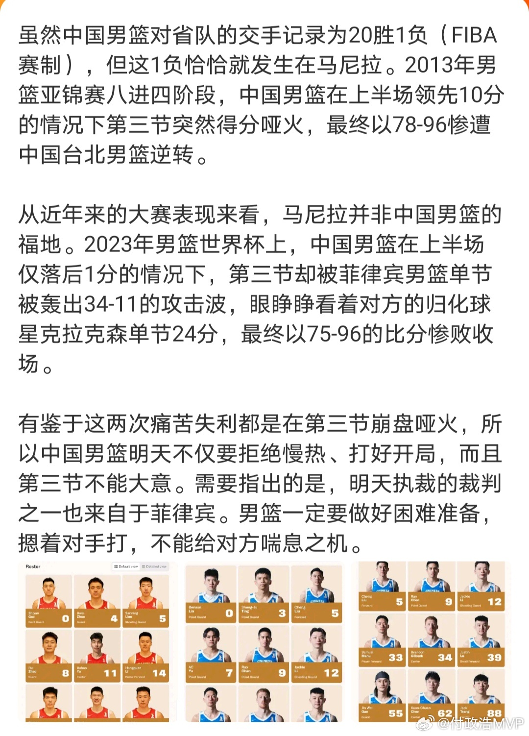 挺诡异!刚翻了翻自己写的比赛前瞻,专门强调中国男篮之前两次在菲律宾输球都是第三节进攻哑火,第三节千万别大意。结果这次又是第三节哑火,最多落后11分。中国男篮在菲律宾比赛难道有第三节魔咒?中国男篮险胜中国台北男篮